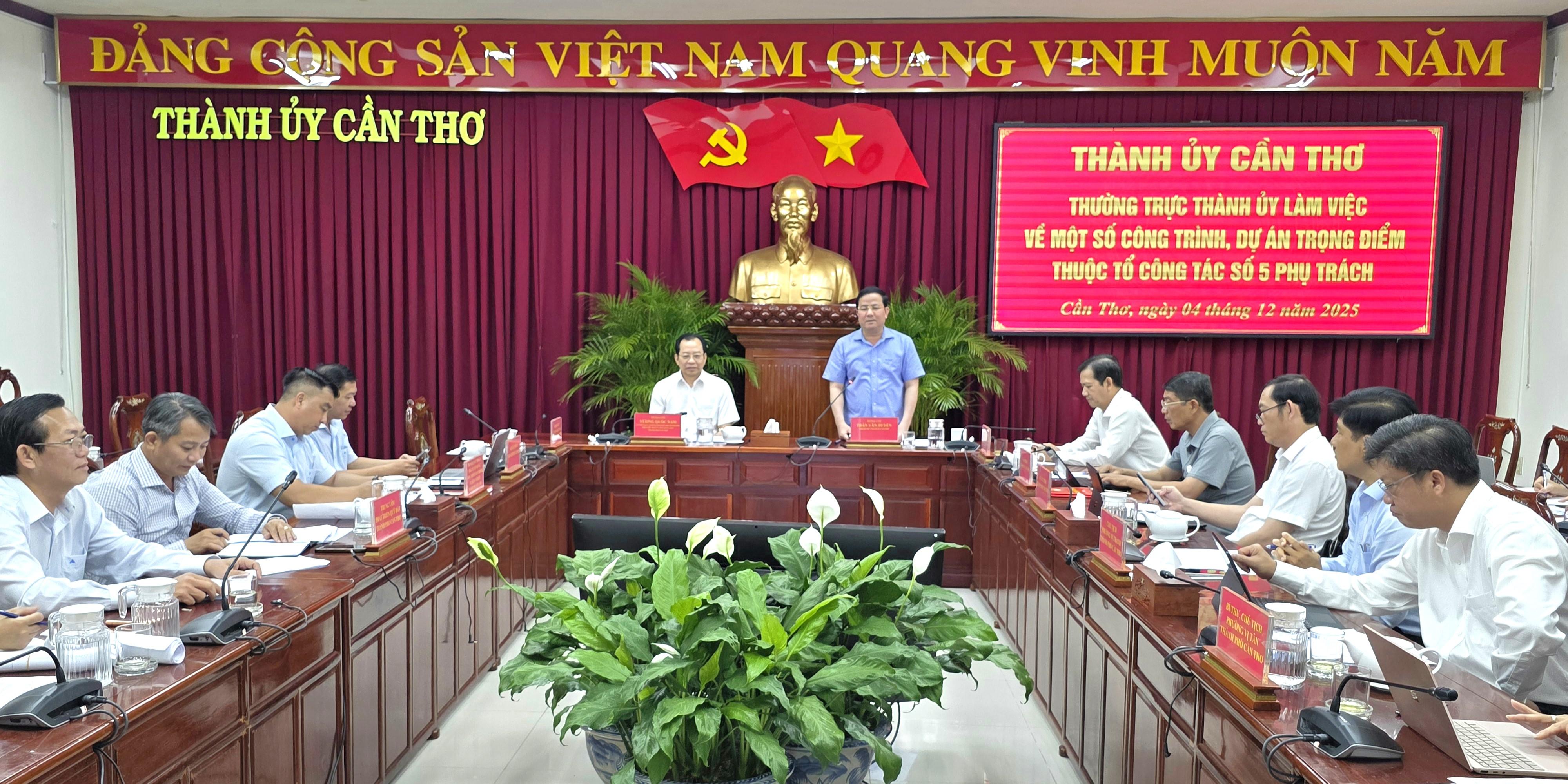 Sáng 04/12, ông Trần Văn Huyến, Phó Bí thư Thành ủy Cần Thơ, Tổ trưởng Tổ Công tác số 5 chủ trì cuộc họp Tổ công tác chỉ đạo triển khai các dự án trọng điểm trên địa bàn thành phố (Tổ công tác số 5) nghe báo cáo tiến độ thực hiện Dự án cầu và đường Nguyễn Chí Thanh, Dự án đầu tư xây dựng và kinh doanh kết cấu hạ tầng Khu công nghiệp Sông Hậu 2, Dự án đầu tư xây dựng và kinh doanh kết cấu hạ tầng Khu công nghiệp Đông Phú 2. Ông Vương Quốc Nam, Phó Chủ tịch UBND TP Cần Thơ, cùng các sở, ngành liên quan tham dự cuộc họp.