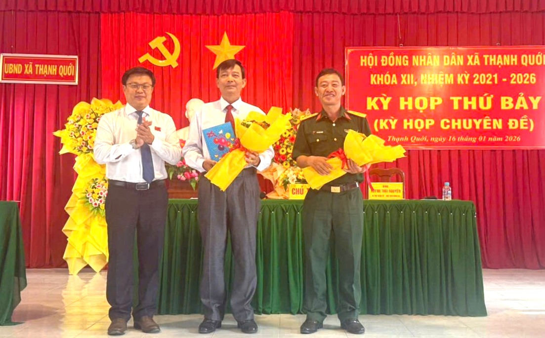 Lãnh đạo xã Thạnh Quới tặng hoa chúc mừng những người vừa được HĐND xã cho thôi làm đại biểu NĐND xã và được bầu làm Ủy viên UBND xã.