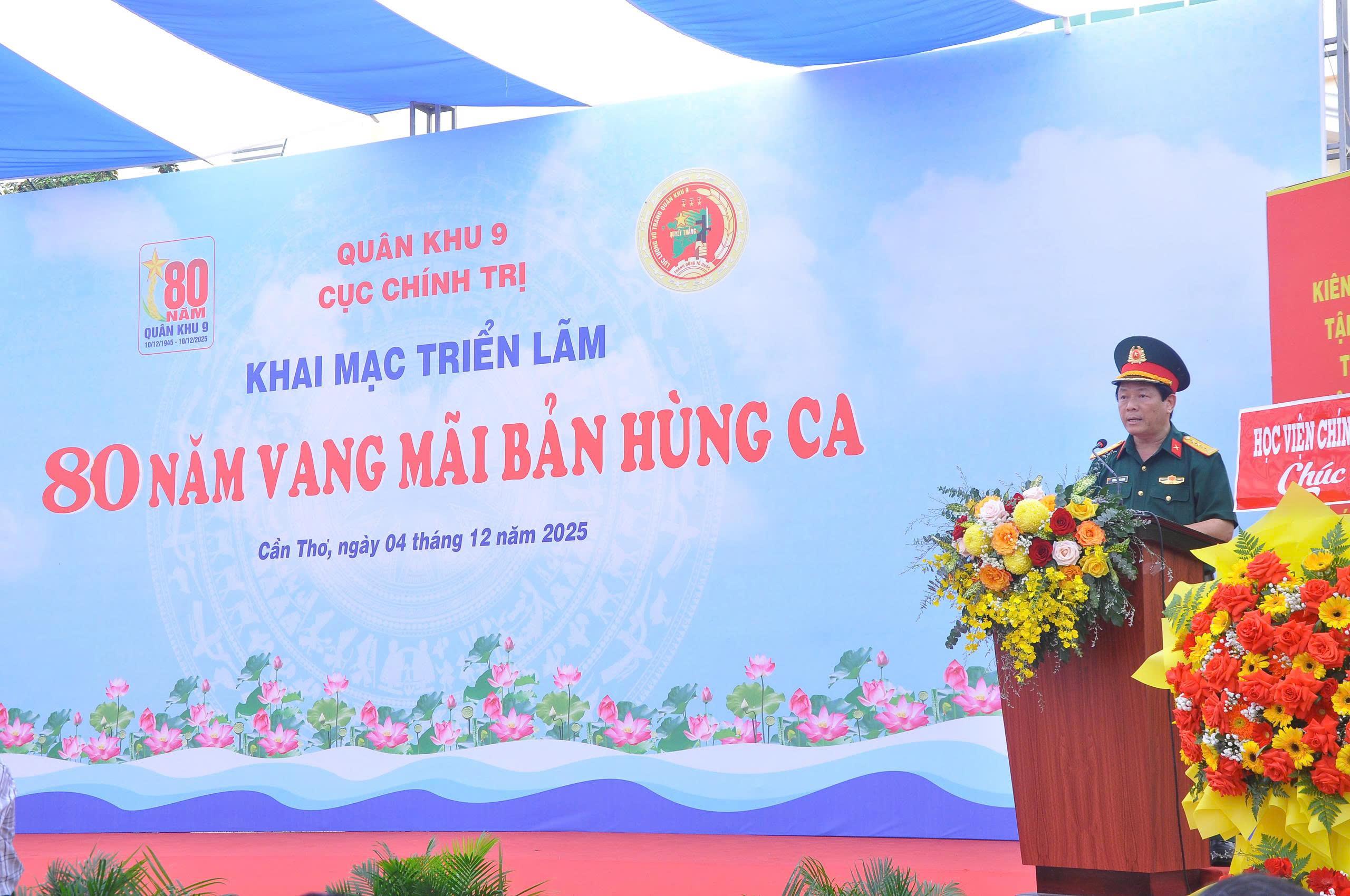 Đại tá Dương Công Sang, Chủ nhiệm Chính trị Quân khu 9, phát biểu khai mạc triển lãm chuyên đề “80 năm vang mãi bản hùng ca”.