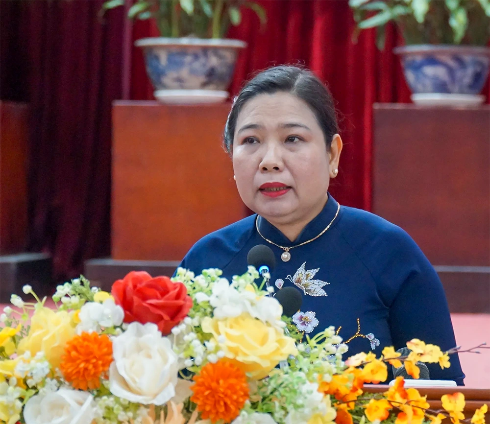 Bà Hồ Thị Cẩm Đào, Phó Bí thư Thành ủy, Chủ tịch Ủy ban MTTQVN thành phố trình bày báo cáo tổng kết thực hiện Nghị quyết số 18 tại hội nghị.