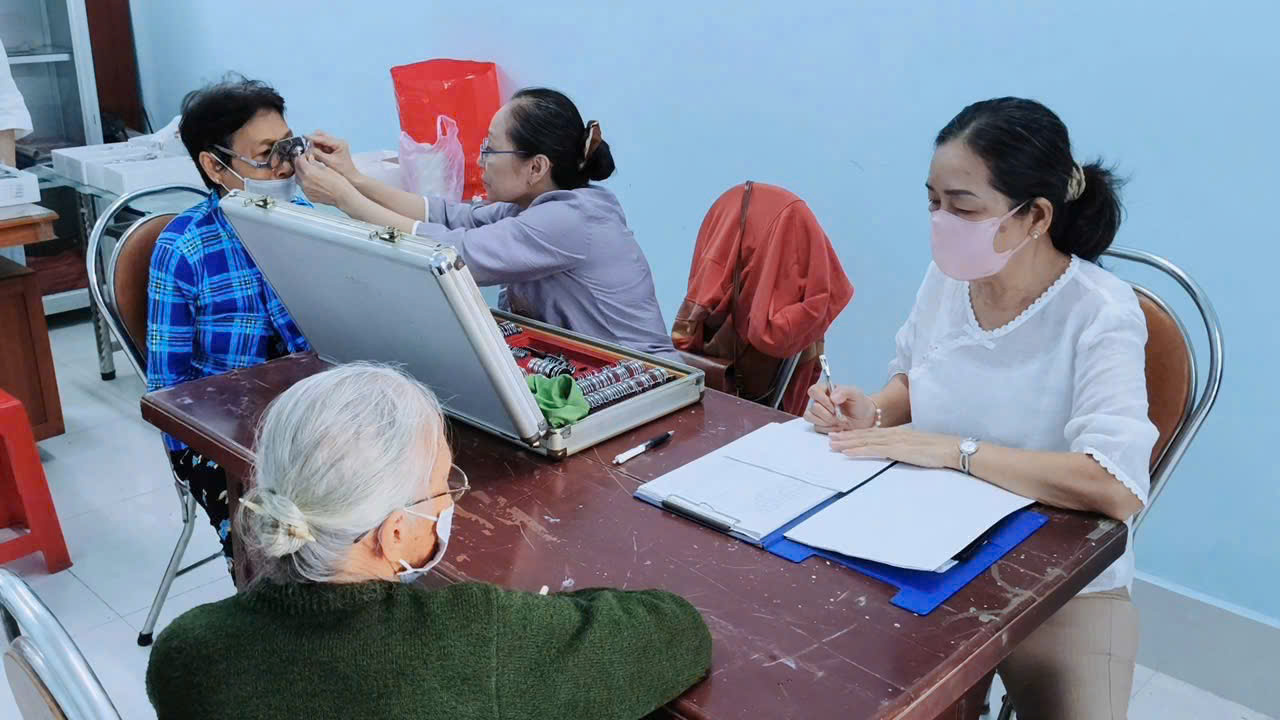 Các y bác sĩ kiểm tra và đo thị lực mắt cho người dân