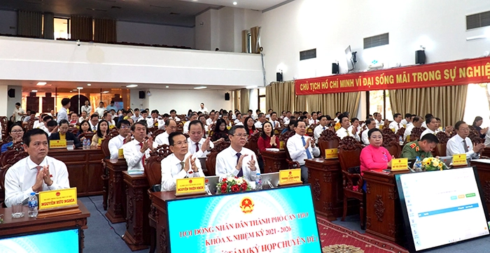 Lãnh đạo thành phố và các đại biểu dự kỳ họp. Ảnh: An Bình.