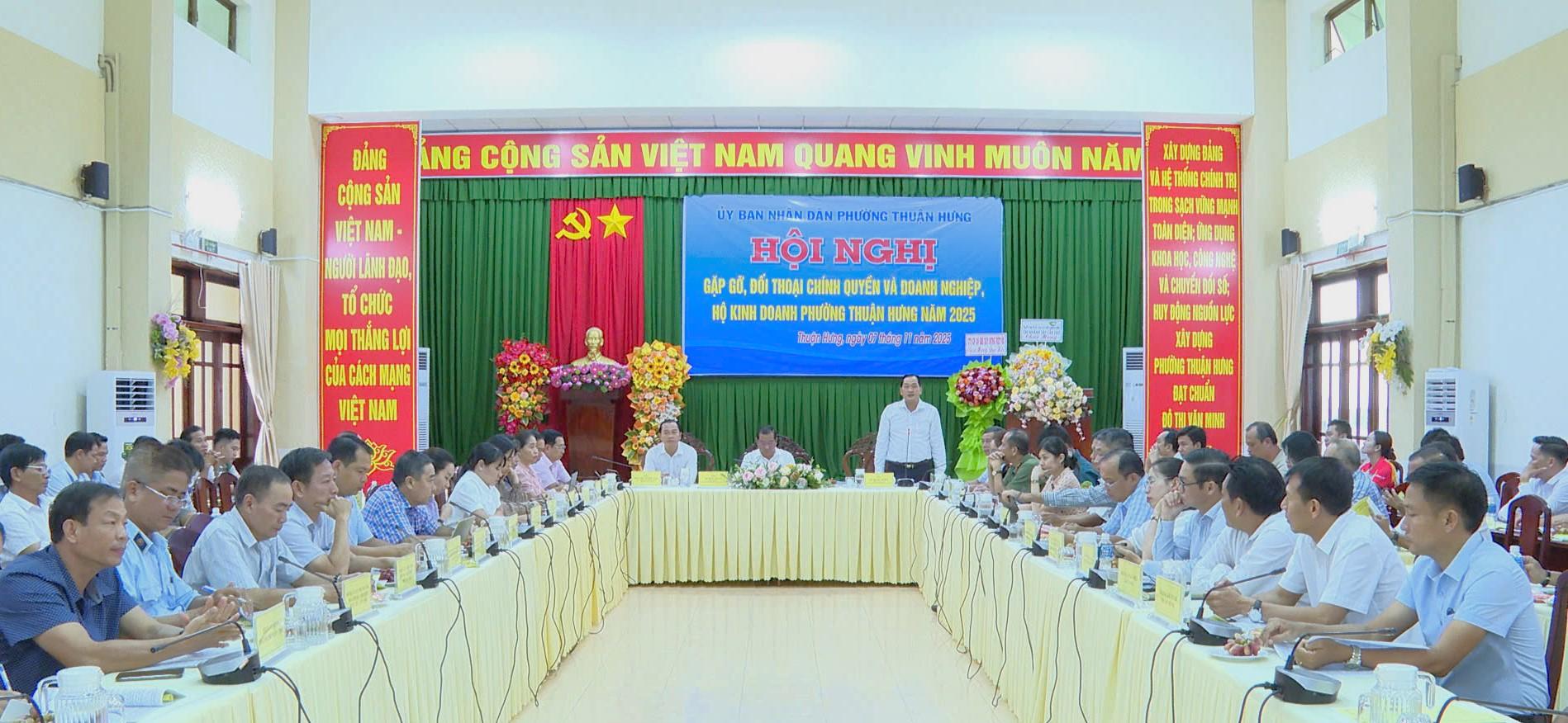 UBND phường Thuận Hưng vừa tổ chức Hội nghị gặp gỡ, đối thoại giữa chính quyền và doanh nghiệp, hộ kinh doanh trên địa bàn phường năm 2025. Ông Lê Đức Toàn, Bí thư Đảng ủy, Chủ tịch HĐND phường Thuận Hưng; ông Nguyễn Ngọc Tấn, Phó Bí thư Thường trực Đảng ủy phường; ông Lê Minh Triết, Phó Bí thư, Chủ tịch UBND phường cùng hơn 100 doanh nghiệp, hợp tác xã, hộ sản xuất kinh doanh đóng trên địa bàn cùng tham dự.