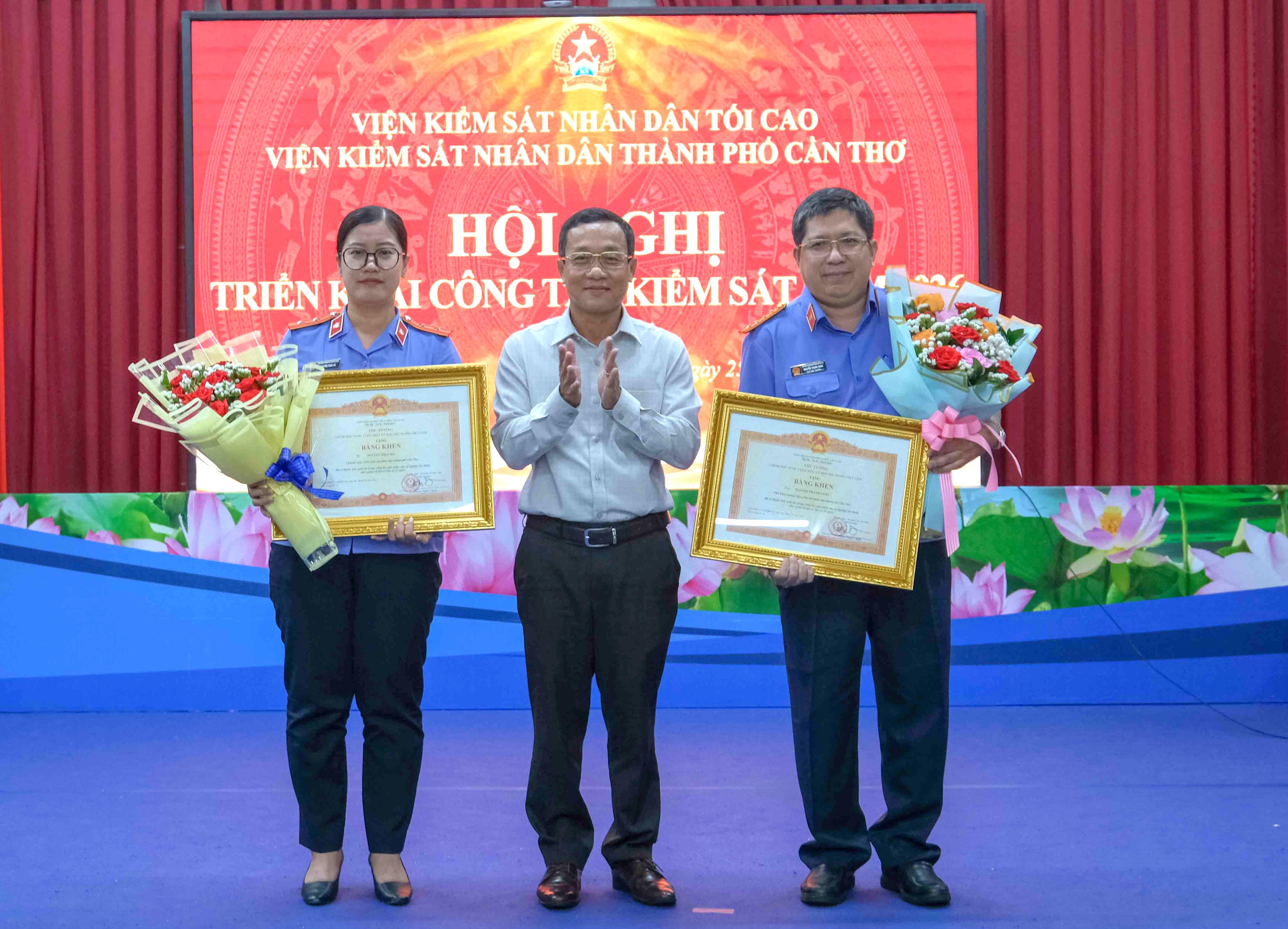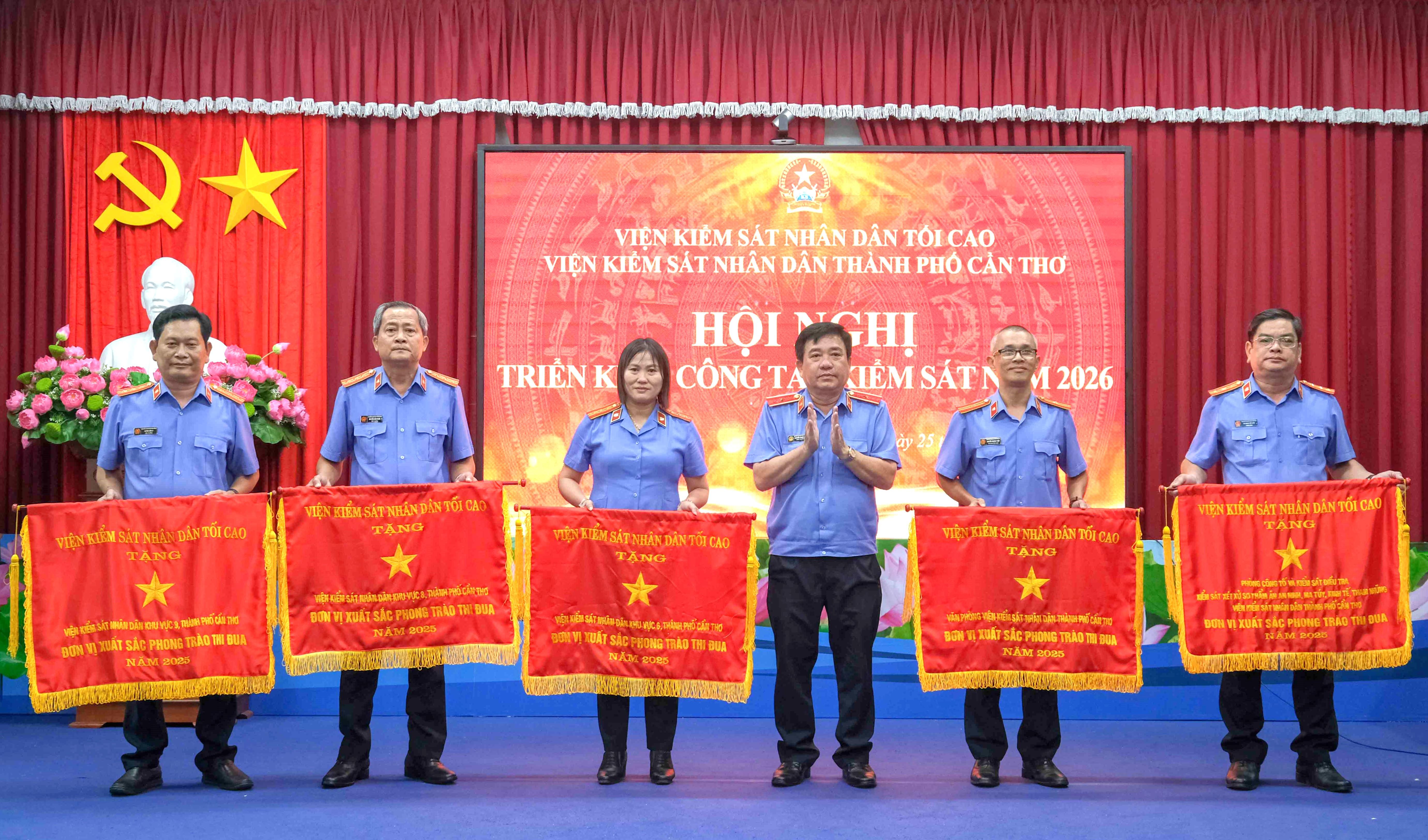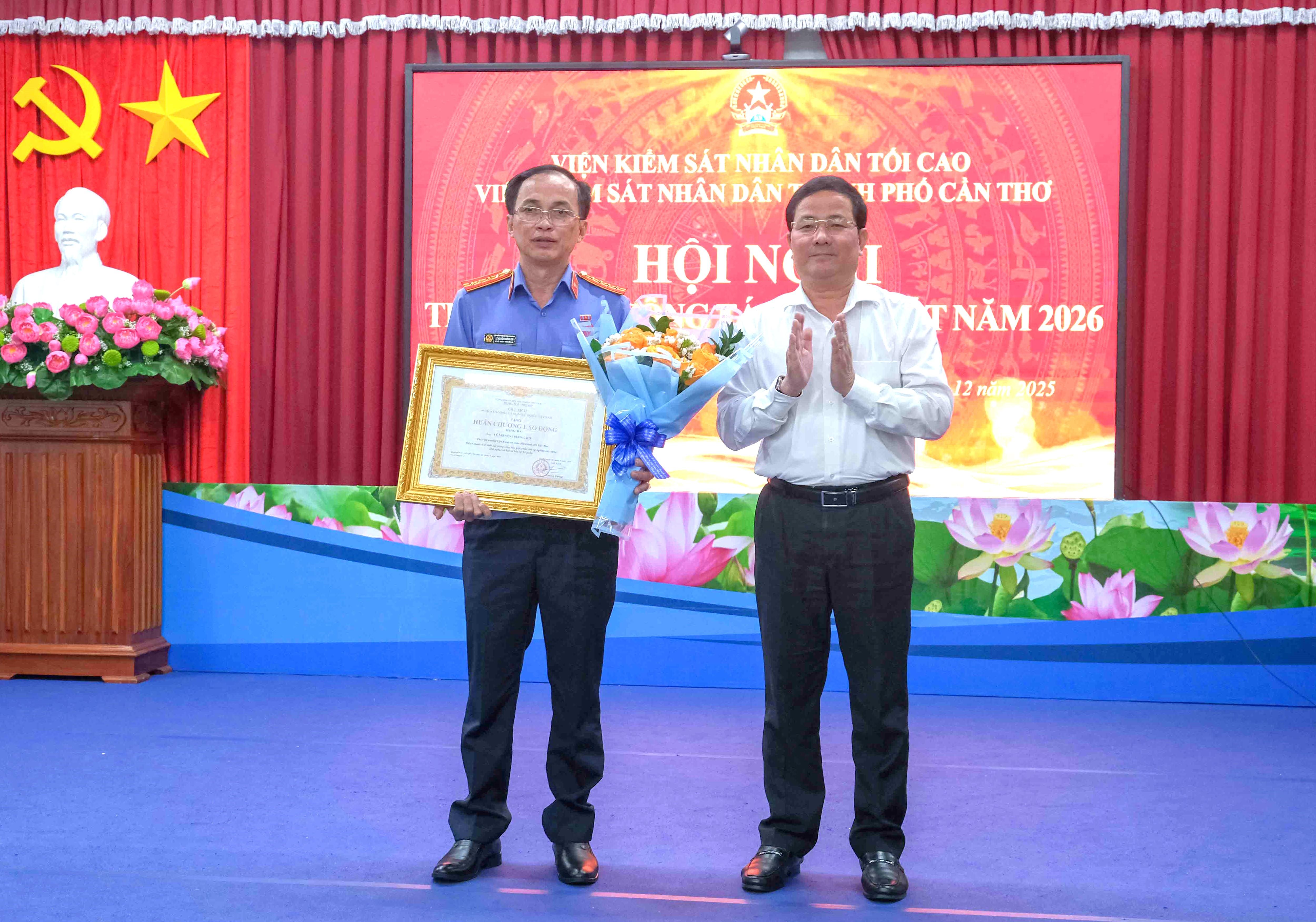 Thay mặt lãnh đạo thành phố, Phó Bí thư Thành ủy Trần Văn Huyến chúc mừng các tập thể nhận Cờ thi đua của ngành Kiểm sát, các cá nhân nhận Huân chương Lao động hạng Nhì, hạng Ba và Bằng khen của Thủ tướng Chính phủ. Bước sang năm 2026 - năm diễn ra Đại hội toàn quốc lần thứ XIV của Đảng và bầu cử Đại biểu Quốc hội, HĐND các cấp, đồng chí Phó Bí thư Thành ủy yêu cầu ngành Kiểm sát Cần Thơ phải đóng vai trò then chốt trong việc giữ vững ổn định chính trị, trật tự an toàn xã hội để phục vụ mục tiêu chiến lược đưa thành phố trở thành cực tăng trưởng của cả nước vào năm 2030.