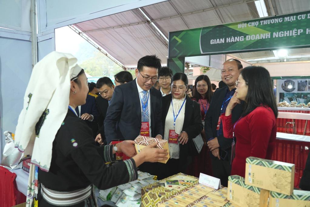 Sau lễ khai mạc, lãnh đạo hai bên tham quan các gian hàng trưng bày sản phẩm tại hội chợ, bày tỏ sự quan tâm, đánh giá cao nỗ lực của các đơn vị, doanh nghiệp trong việc đưa các sản phẩm đặc trưng, sản phẩm OCOP, nông sản an toàn đến với người tiêu dùng. Đồng thời, mong muốn các doanh nghiệp tiếp tục nâng cao chất lượng, mẫu mã, đáp ứng yêu cầu thị trường, góp phần thúc đẩy hoạt động thương mại biên giới ngày càng phát triển.