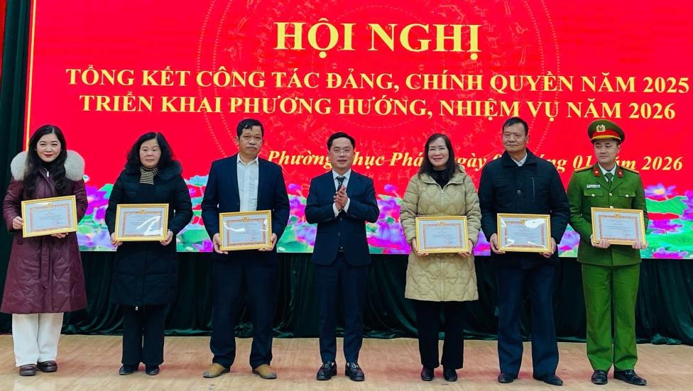 Bí thư Đảng ủy, Chủ tịch HĐND phường Thục Phán Nguyễn Thế Hoàn tặng giấy khen các tập thể hoàn thành xuất sắc nhiệm vụ năm 2025.