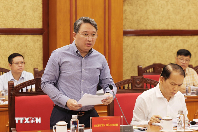 Ông Nguyễn Hải Ninh, Ủy viên Trung ương Đảng, Bí thư Đảng ủy, Bộ trưởng Bộ Tư pháp, báo cáo tại hội nghị. (Ảnh: Lâm Khánh/TTXVN)