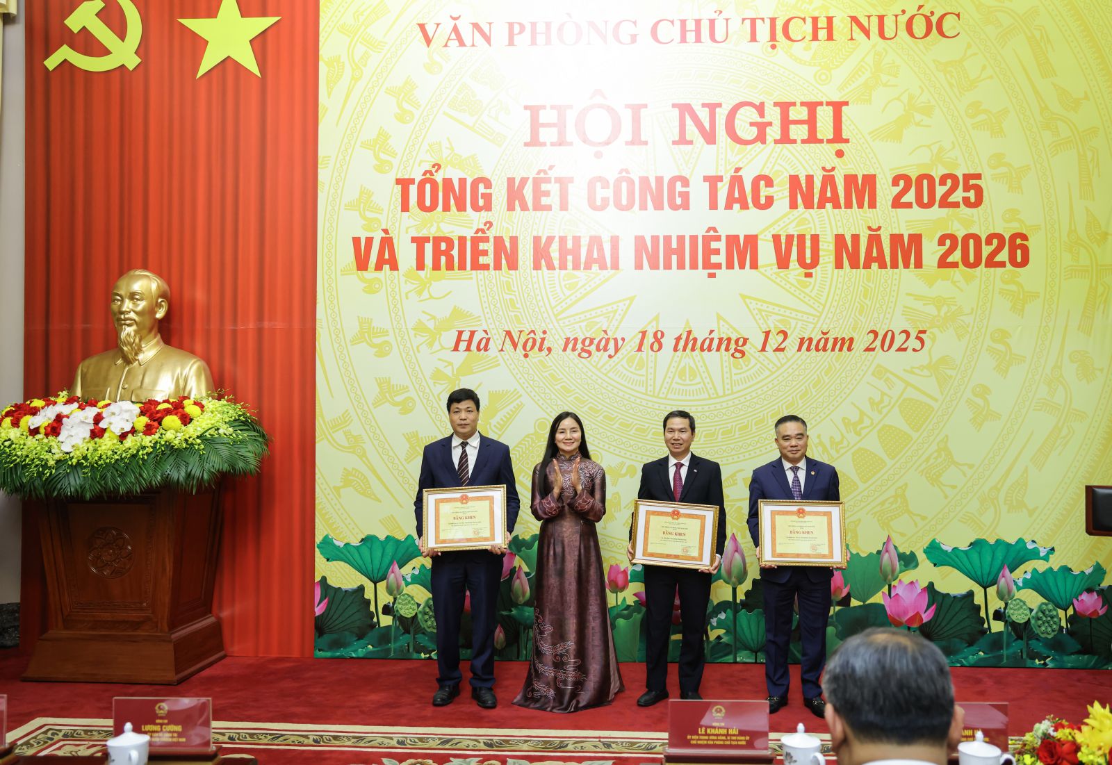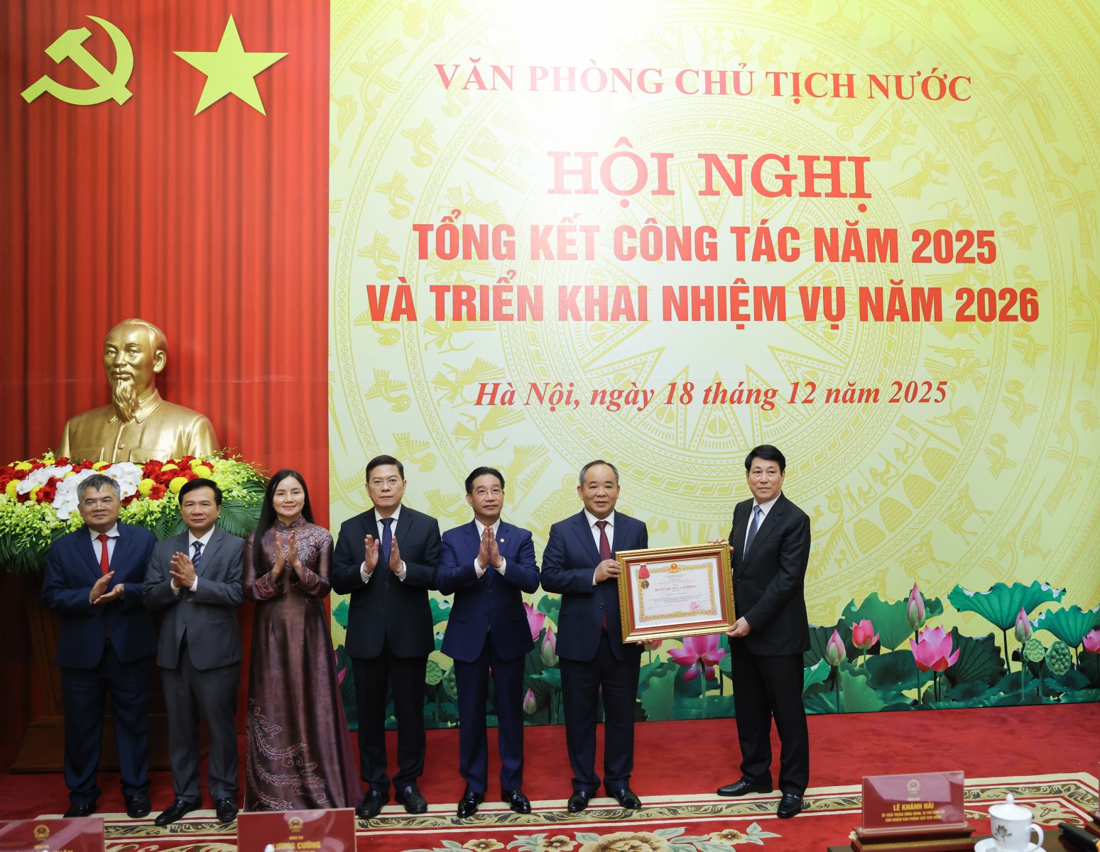 Thay mặt Lãnh đạo Đảng, Nhà nước, Chủ tịch nước ghi nhận và biểu dương những kết quả mà tập thể lãnh đạo, công chức, người lao động của Văn phòng Chủ tịch nước đã đạt được trong năm 2025; đồng thời chúc mừng các tập thể, cá nhân đã hoàn thành xuất sắc nhiệm vụ năm qua và vinh dự được đón nhận các hình thức khen thưởng, danh hiệu thi đua tại Hội nghị.