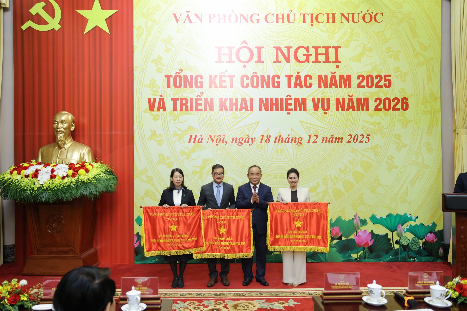 Chủ nhiệm Văn phòng Chủ tịch nước Lê Khánh Hải trao cờ thi đua tặng các đơn vị. Ảnh: VPCTN