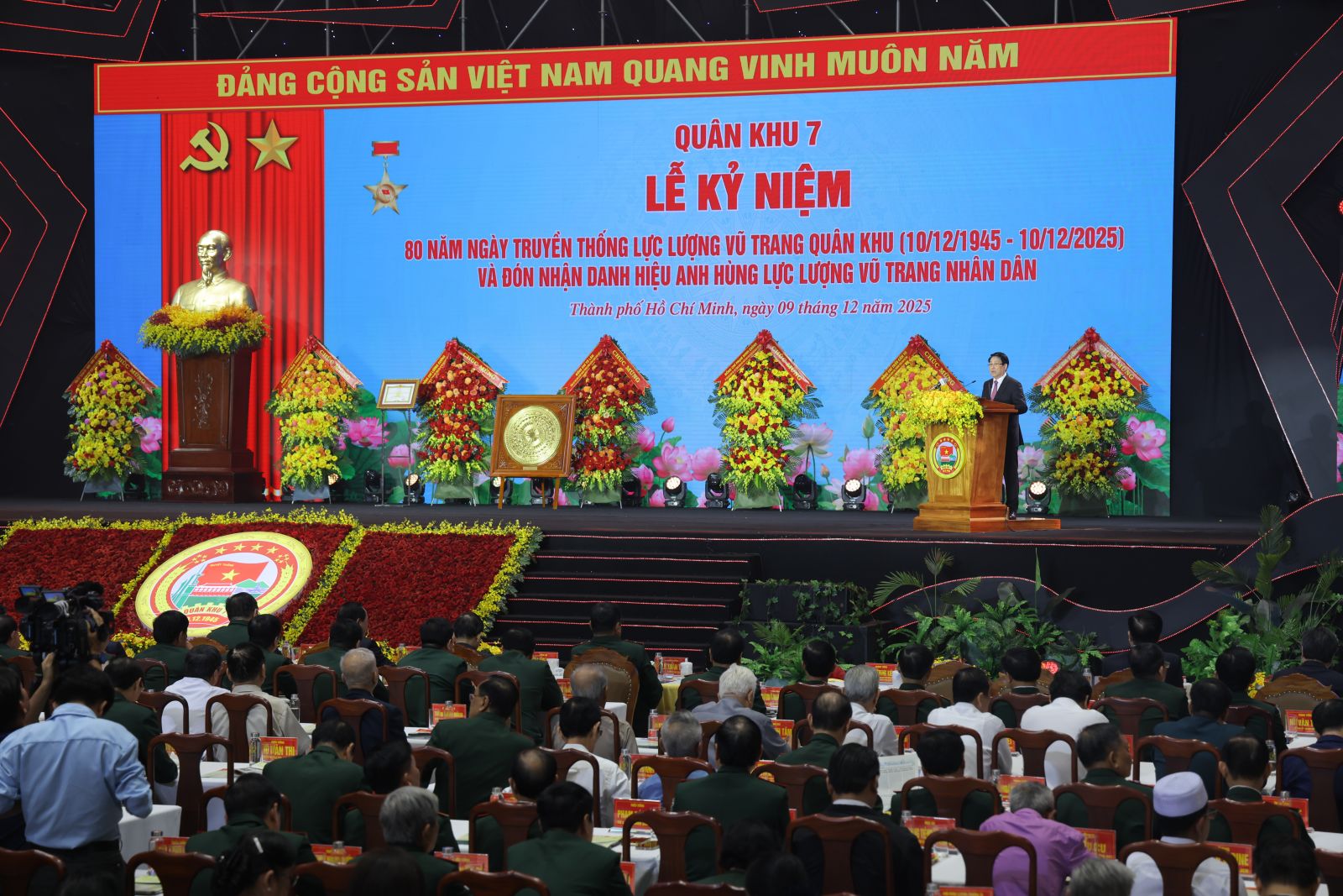 Phát biểu tại buổi lễ, Chủ tịch nước Lương Cường nêu rõ, trải qua 80 năm, chiến đấu, xây dựng và trưởng thành; dưới sự lãnh đạo, chỉ đạo của Trung ương Đảng, thường xuyên, trực tiếp là Quân ủy Trung ương, Bộ Quốc phòng; sự ủng hộ, phối hợp, giúp đỡ của cấp ủy, chính quyền các địa phương; sự thương yêu, đùm bọc của nhân dân, các thế hệ cán bộ, chiến sĩ Lực lượng vũ trang Quân khu 7 đã kế thừa, giữ vững và phát huy truyền thống anh hùng, bất khuất trong lịch sử dựng nước và giữ nước của dân tộc Việt Nam; truyền thống oanh liệt, hào hùng của vùng đất miền Đông Nam Bộ gian lao mà anh dũng. Lực lượng vũ trang Quân khu 7 tuyệt đối trung thành với Đảng, với Tổ quốc, gắn bó máu thịt với nhân dân, đoàn kết, nỗ lực vượt qua mọi khó khăn, thử thách, anh dũng chiến đấu, lập được nhiều chiến công xuất sắc, đóng góp to lớn cùng toàn Đảng, toàn dân, toàn quân giành được những thắng lợi vĩ đại trong sự nghiệp đấu tranh giải phóng dân tộc, thống nhất đất nước, cũng như trong công cuộc xây dựng, bảo vệ Tổ quốc Việt Nam xã hội chủ nghĩa và làm tròn nghĩa vụ quốc tế vẻ vang.