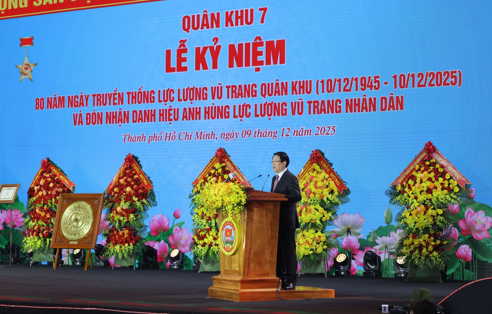 Thay mặt lãnh đạo Đảng, Nhà nước, Chủ tịch nước đánh giá cao và nhiệt liệt chúc mừng những chiến công, thành tích và đóng góp to lớn của Lực lượng vũ trang Quân khu 7 đối với sự nghiệp cách mạng vẻ vang của Đảng, của dân tộc trong suốt 80 năm qua.