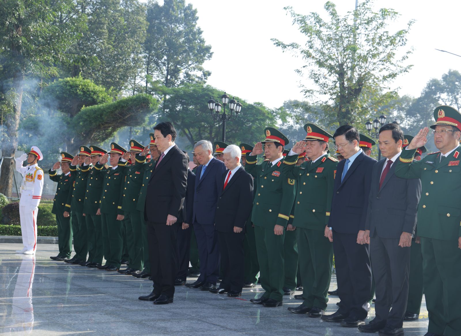 Chủ tịch nước Lương Cường và các đại biểu dâng hương, dâng hoa tại tượng đài Bác Hồ. Ảnh: VPCTN