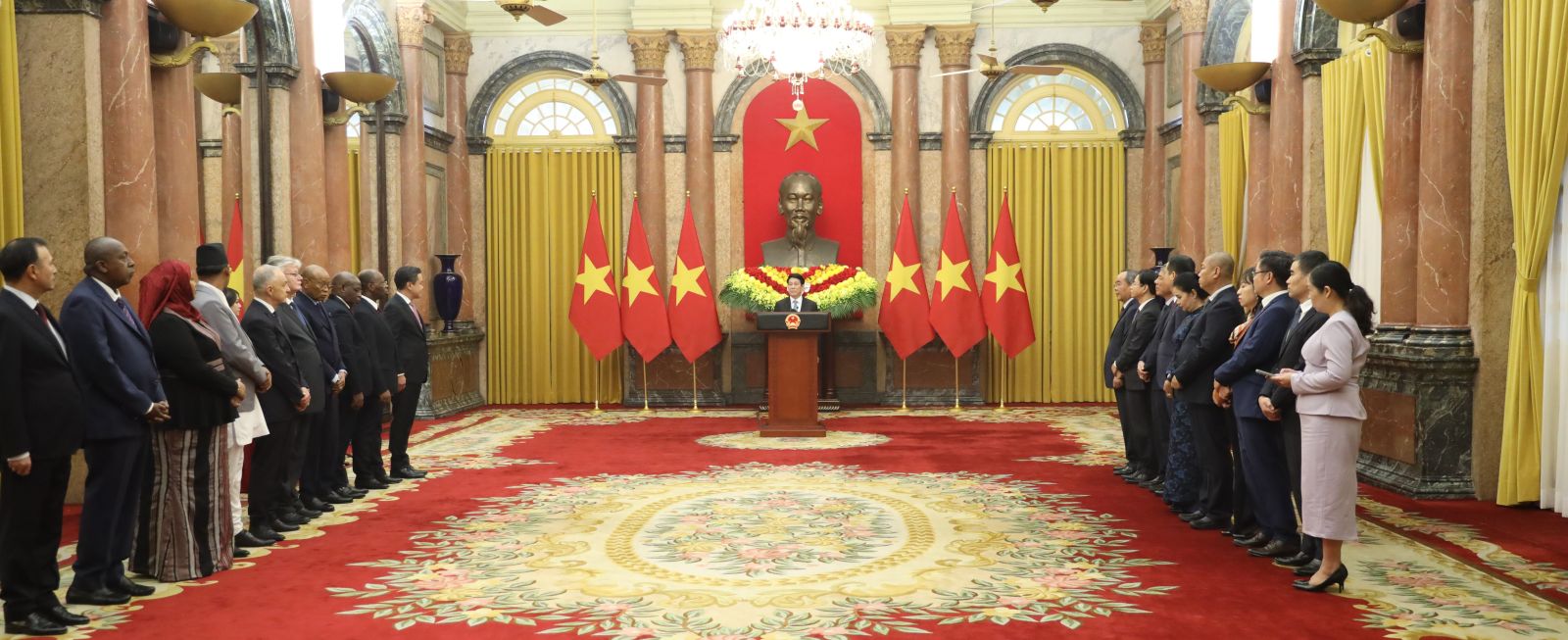 Phát biểu tại lễ trình Quốc thư của các Đại sứ kiệm nhiệm tại Việt Nam đến từ các nước: Latvia, Albania, Nepal, Uzbekistan, Djibouti, Gabon, Guinea Xích đạo, Somalia, Chad và Paraguay, Chủ tịch nước cho biết trong bối cảnh thế giới chứng kiến nhiều biến động sâu sắc về địa chính trị, kinh tế và an ninh, cùng các thách thức truyền thống và phi truyền thống đan xen, Việt Nam kiên trì phát huy sức mạnh đoàn kết, tiếp tục đổi mới và cơ cấu lại nền kinh tế để hướng tới mục tiêu đến năm 2030 trở thành nước đang phát triển có công nghiệp hiện đại, thu nhập trung bình cao; đến năm 2045 trở thành nước phát triển, thu nhập cao.