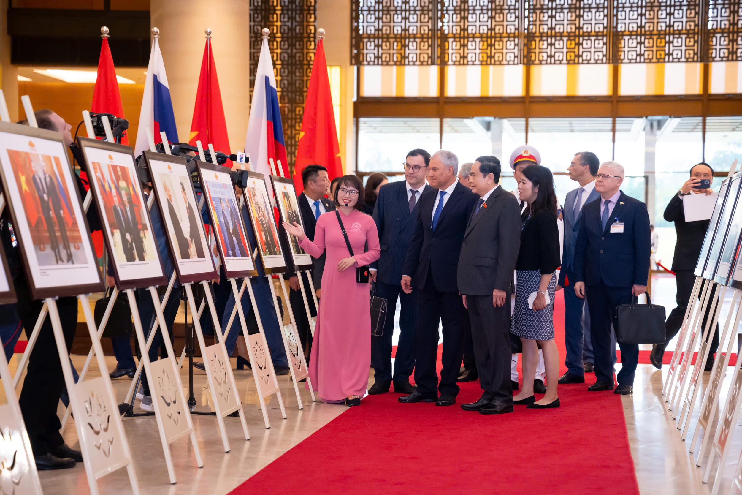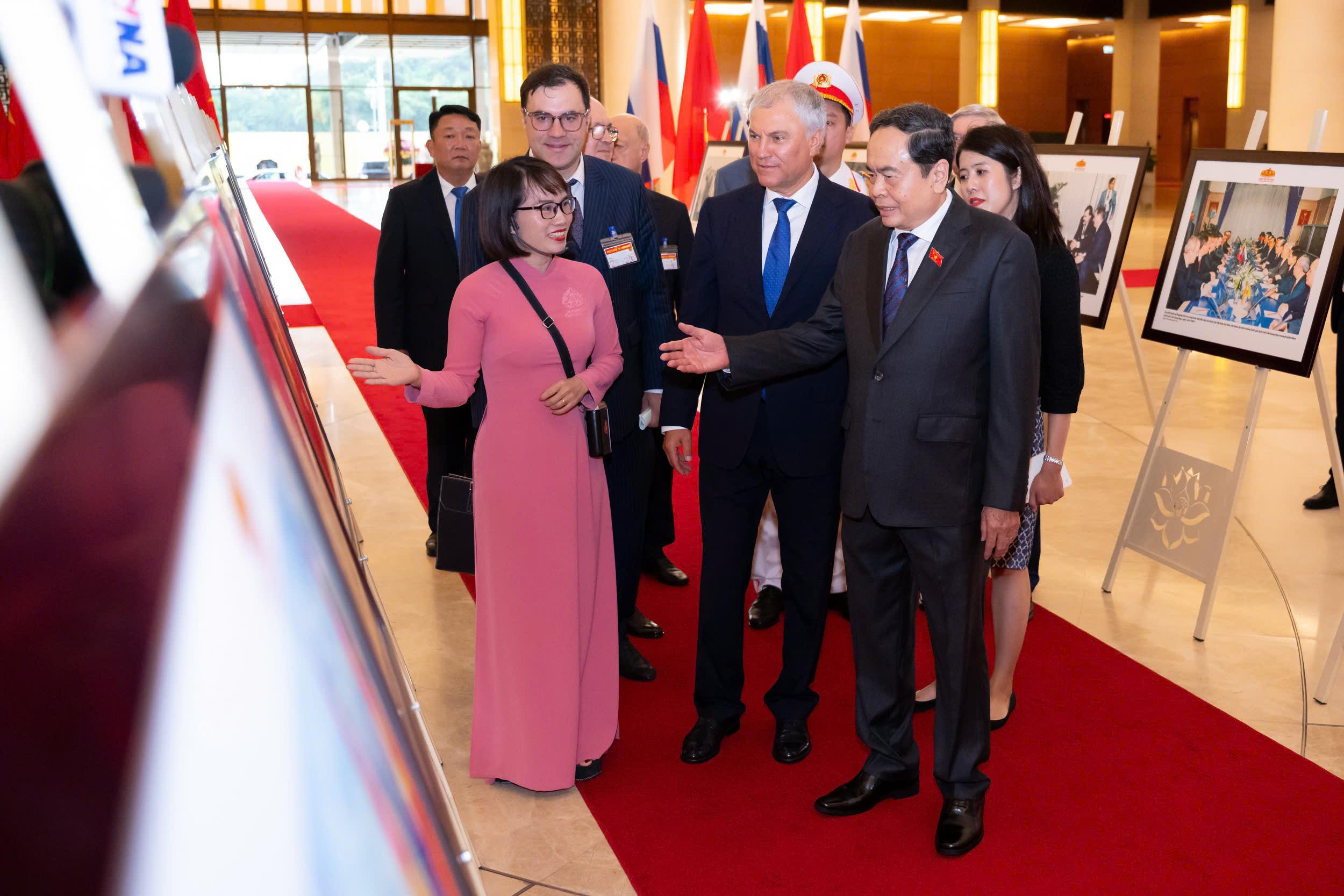 Chủ tịch Quốc hội Trần Thanh Mẫn và Chủ tịch Duma Quốc gia Quốc hội Liên Bang Nga Vyacheslav Volodin xem Trưng bày ảnh về quan hệ Việt Nam - Liên Bang Nga