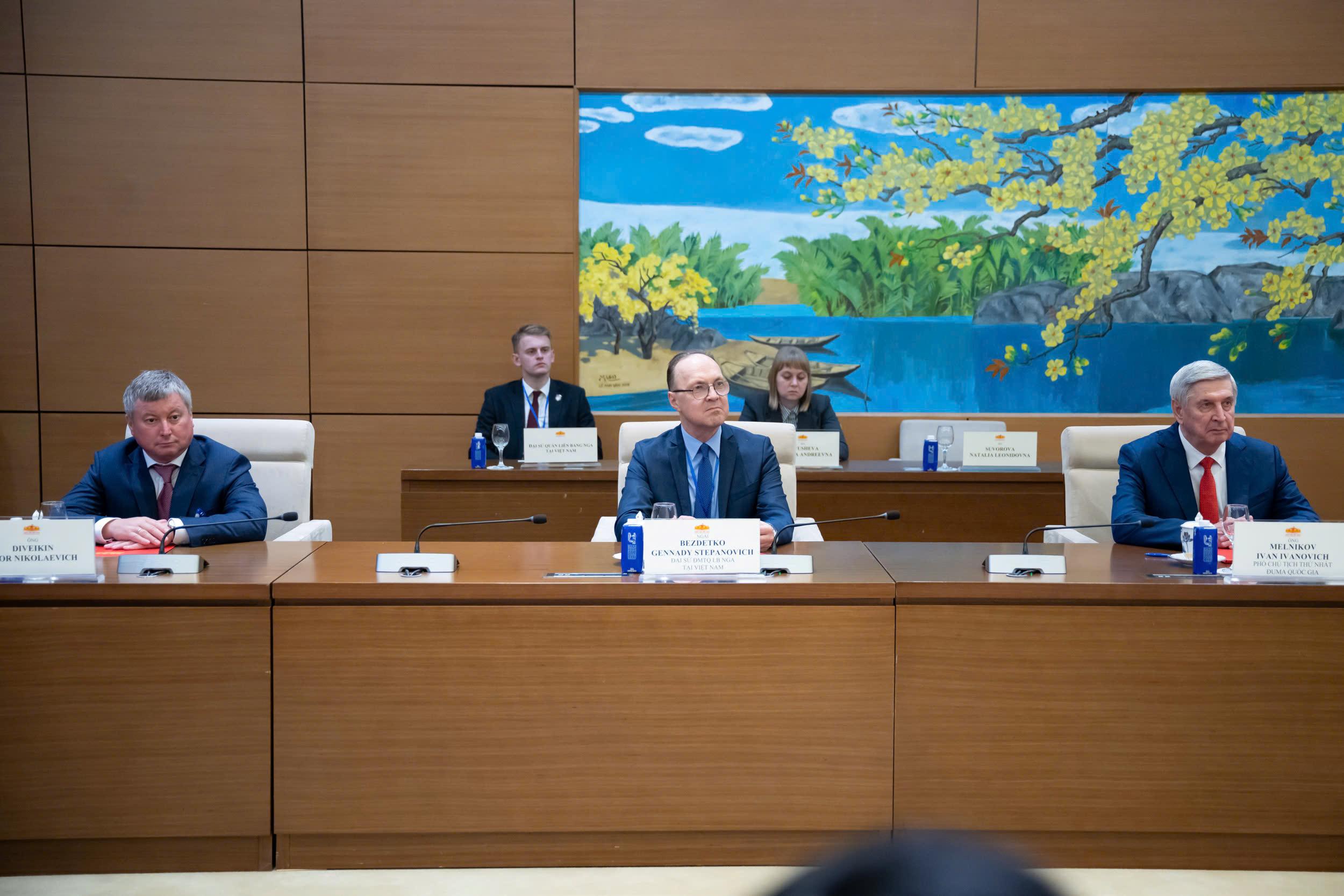 Chủ tịch Duma Quốc gia Quốc hội Liên Bang Nga Vyacheslav Volodin giới thiệu với Chủ tịch Quốc hội Trần Thanh Mẫn các đại biểu Liên Bang Nga