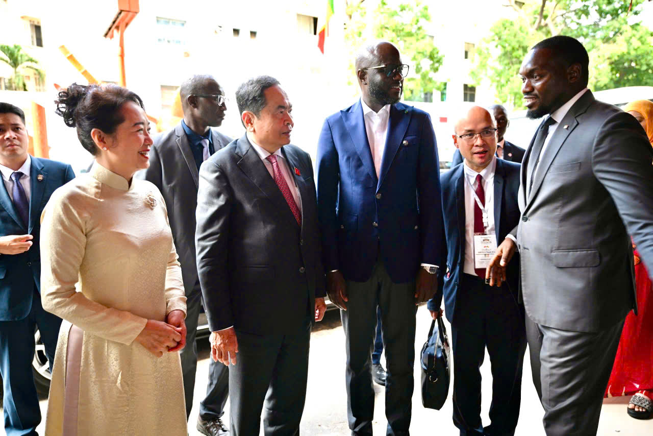 Chủ tịch Quốc hội Senegal Malick Ndiaye và Chủ tịch Liên đoàn Vovinam Senegal Dr Diomaye Dieng chào đón Chủ tịch Quốc hội Trần Thanh Mẫn cùng Phu nhân tới thăm Câu lạc bộ Vovinam tại Senegal