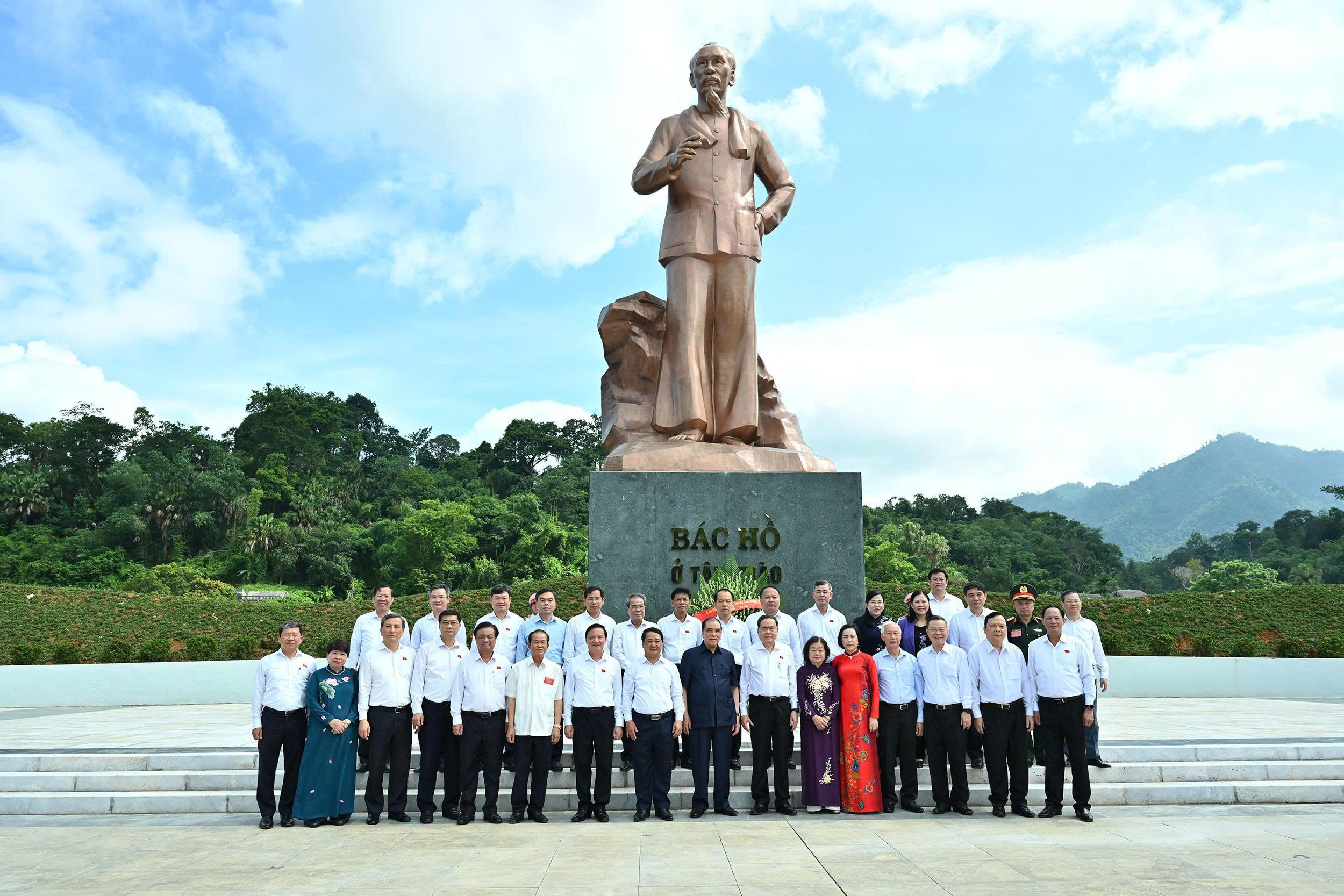 Chủ tịch Quốc hội Trần Thanh Mẫn và các đại biểu chụp ảnh lưu niệm trư Tượng Bác Hồ, Tân Trào, tỉnh Tuyên Quang