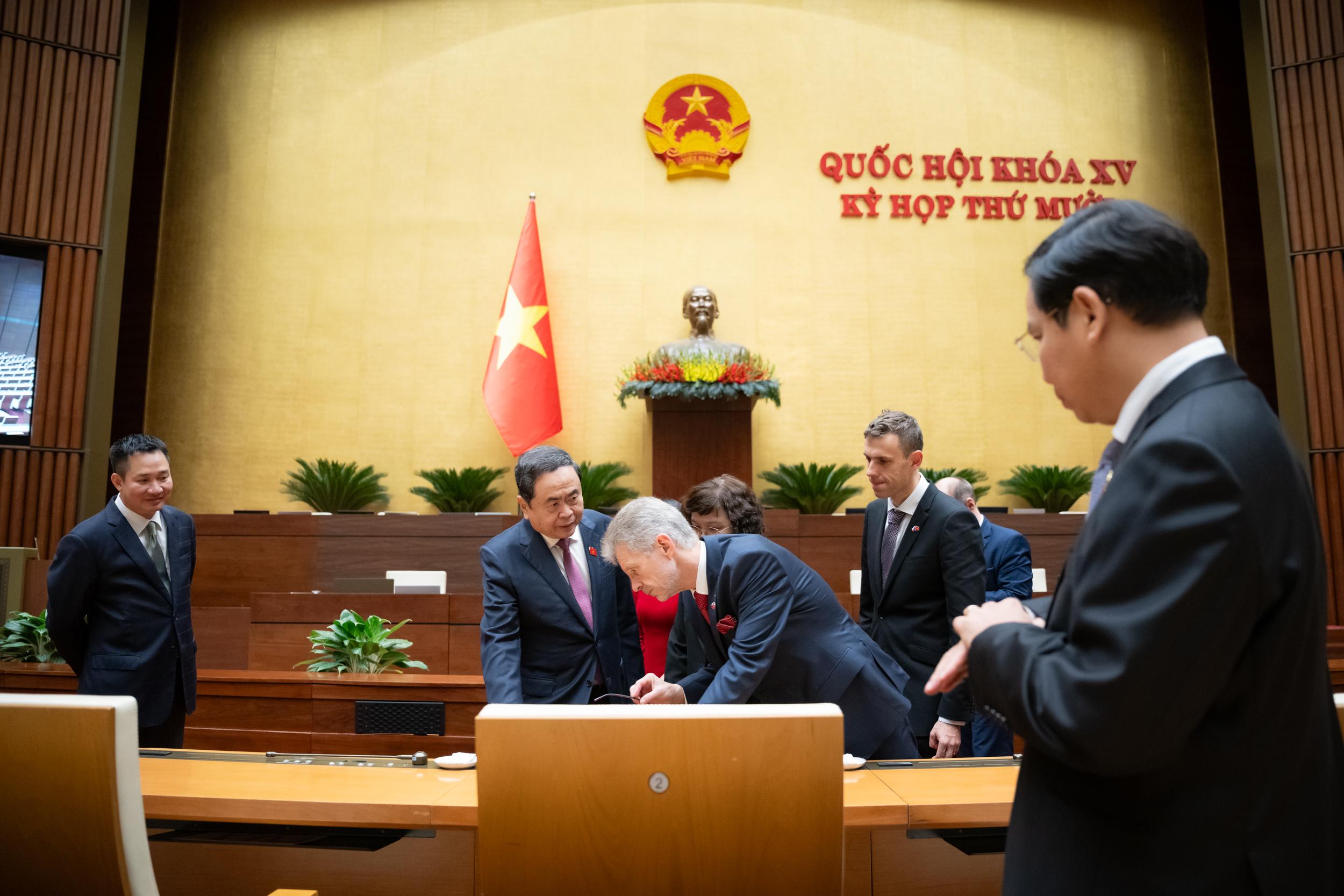 Chủ tịch Quốc hội Trần Thanh Mẫn giới thiệu với Chủ tịch Thượng viện Quốc hội Cộng hòa Séc Milos Vystrcil về phòng họp Diên Hồng, Nhà Quốc hội
