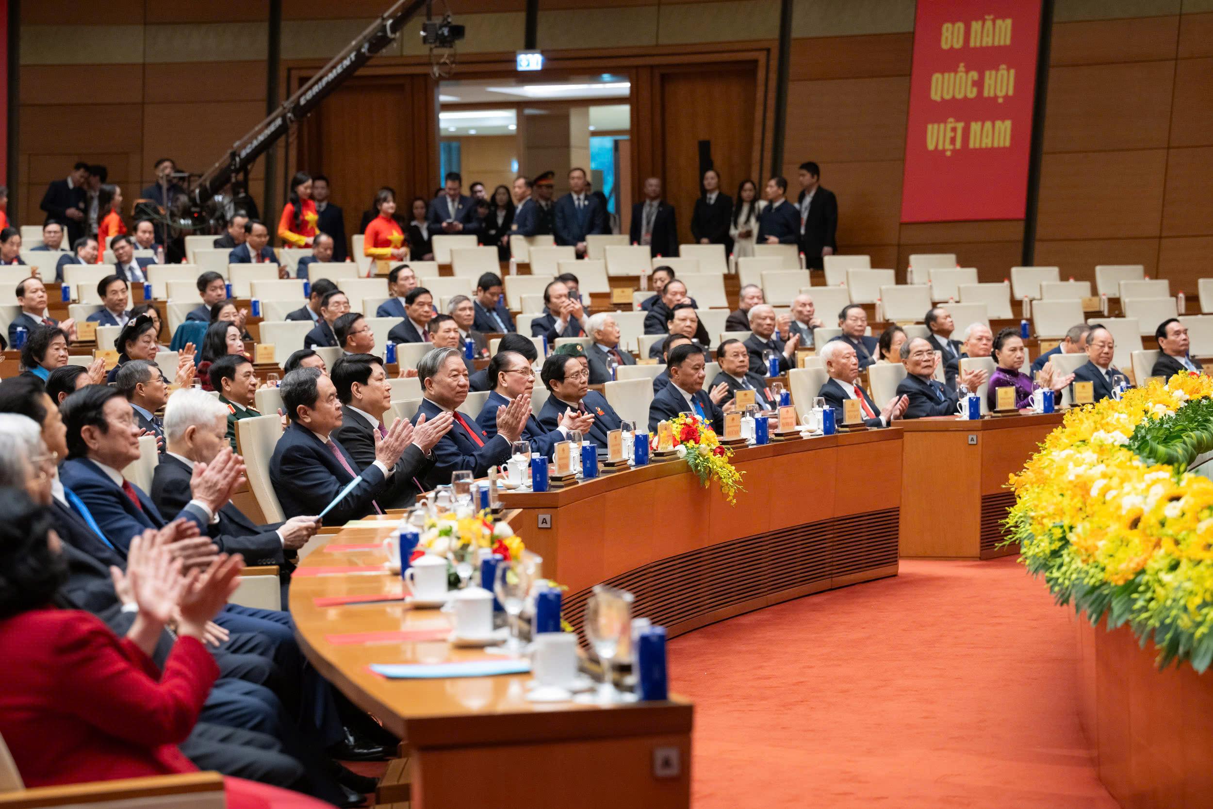 Tổng Bí thư Tô Lâm, nguyên Tổng Bí thư Nông Đức Mạnh, Chủ tịch Quốc hội Trần Thanh Mẫn và các đồng chí lãnh đạo Đảng, Nhà nước dự Lễ kỷ niệm 80 năm Ngày tổng tuyển cử đầu tiên bầu Quốc hội Việt Nam
