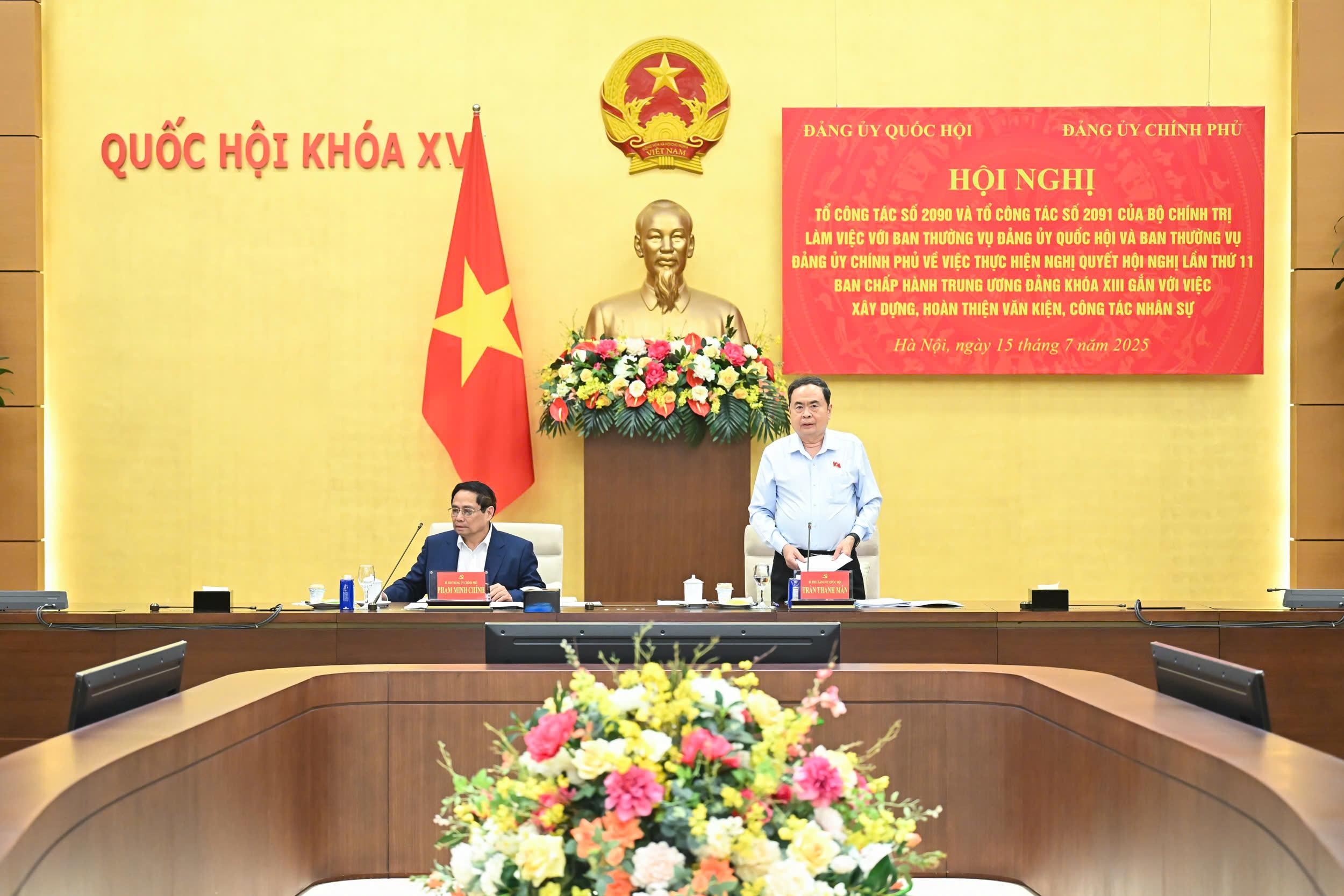 Chiều 15/7, tại Nhà Quốc hội, Uỷ viên Bộ Chính trị, Bí thư Đảng uỷ Quốc hội, Chủ tịch Quốc hội Trần Thanh Mẫn và Uỷ viên Bộ Chính trị, Bí thư Đảng uỷ Chính phủ, Thủ tướng Chính phủ Phạm Minh Chính đồng chủ trì Hội nghị Tổ công tác số 2090 và Tổ công tác số 2091 của Bộ Chính trị làm việc với Ban Thường vụ Đảng uỷ Quốc hội và Ban Thường vụ Đảng uỷ Chính phủ về việc thực hiện Nghị quyết hội nghị lần thứ 11 Ban Chấp hành Trung ương Đảng khoá XIII gắn với việc xây dựng, hoàn thiện văn kiện, công tác nhân sự.