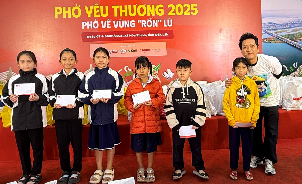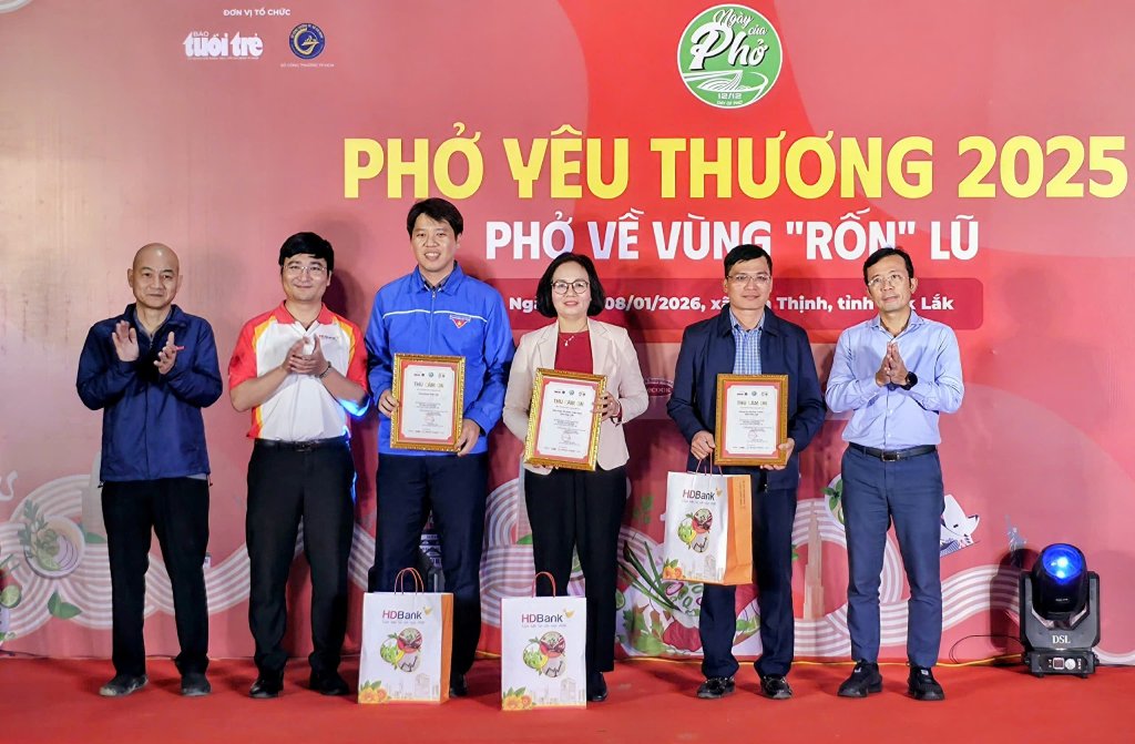 Tối 7/1, tại Nhà Văn hóa xã Hòa Thịnh (tỉnh Đắk Lắk), Báo Tuổi Trẻ phối hợp với Sở Công Thương TP Hồ Chí Minh, Ủy ban Mặt trận Tổ quốc Việt Nam tỉnh Đắk Lắk và xã Hòa Thịnh tổ chức chương trình “Phở yêu thương” hướng về bà con vùng “rốn lũ” Hòa Thịnh - địa phương chịu thiệt hại nặng nề trong đợt mưa lũ lịch sử cuối tháng 11/2025.