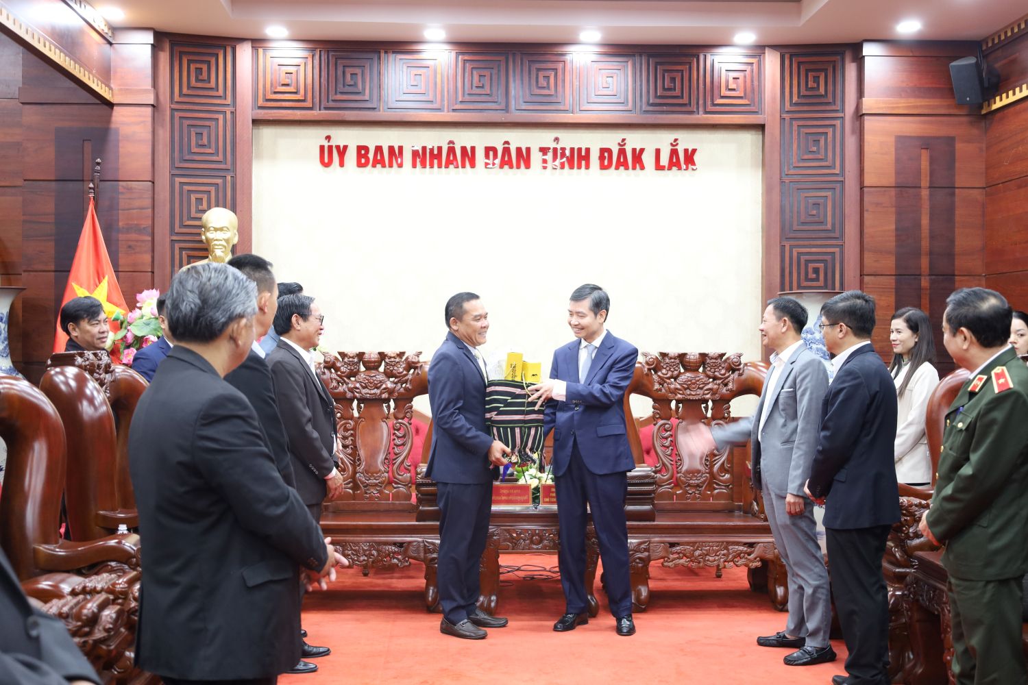 Chủ tịch UBND tỉnh Đắk Lắk Tạ Anh Tuấn tặng quà cho Đoàn công tác tỉnh Mondulkiri, Vương quốc Campuchia