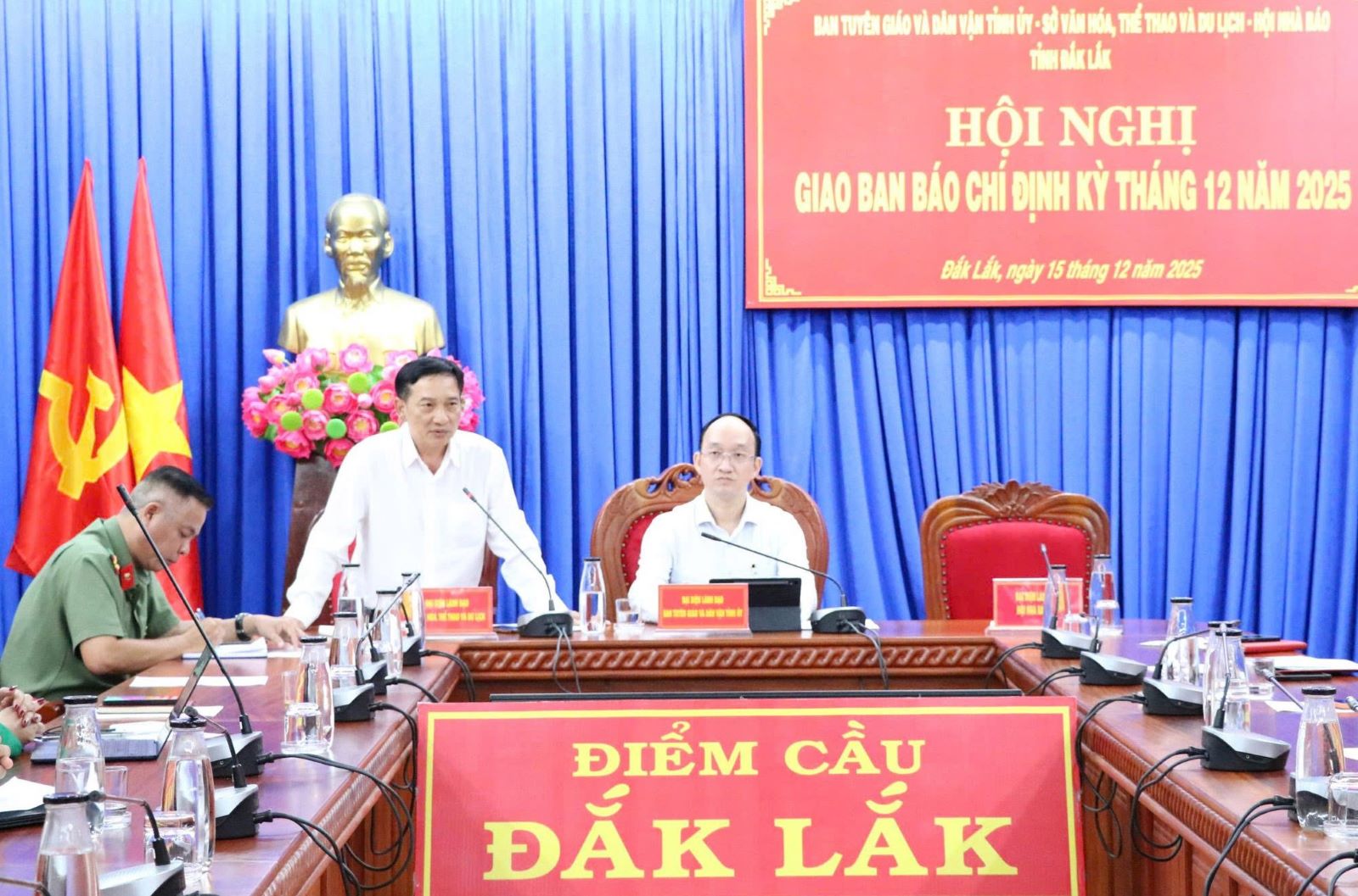 Chiều 15/12, Ban Tuyên giáo và Dân vận Tỉnh ủy Đắk Lắk phối hợp với Sở Văn hóa, Thể thao và Du lịch Đắk Lắk và Hội Nhà báo tỉnh Đắk Lắk tổ chức Hội nghị giao ban báo chí định kỳ tháng 12/2025.