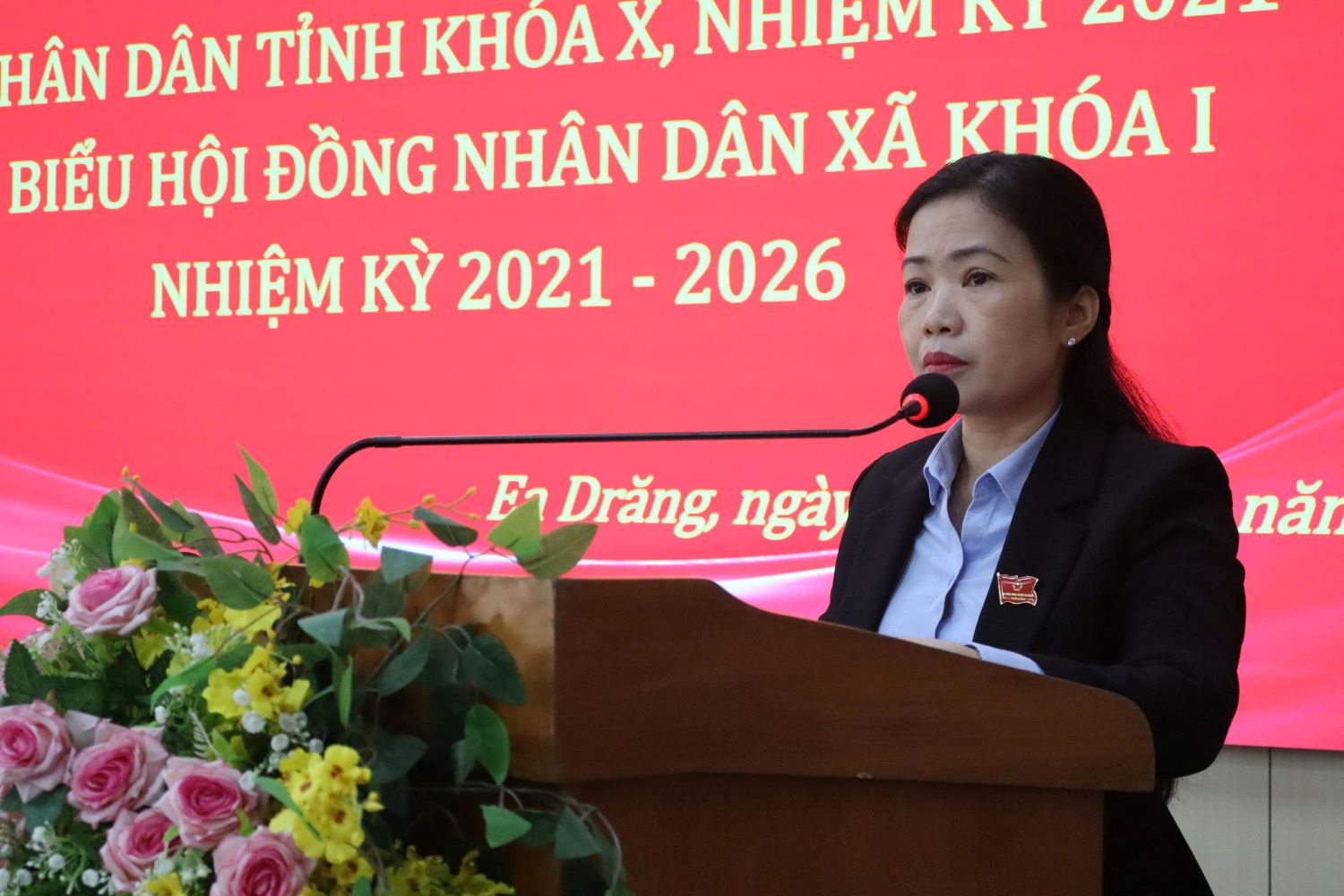 Đồng chí Bùi Thị Hà Giang - Bí thư Đảng ủy, Chủ tịch HĐND xã Ea Drăng báo cáo với cử tri kết quả Kỳ họp thứ Hai, HĐND tỉnh khóa X.