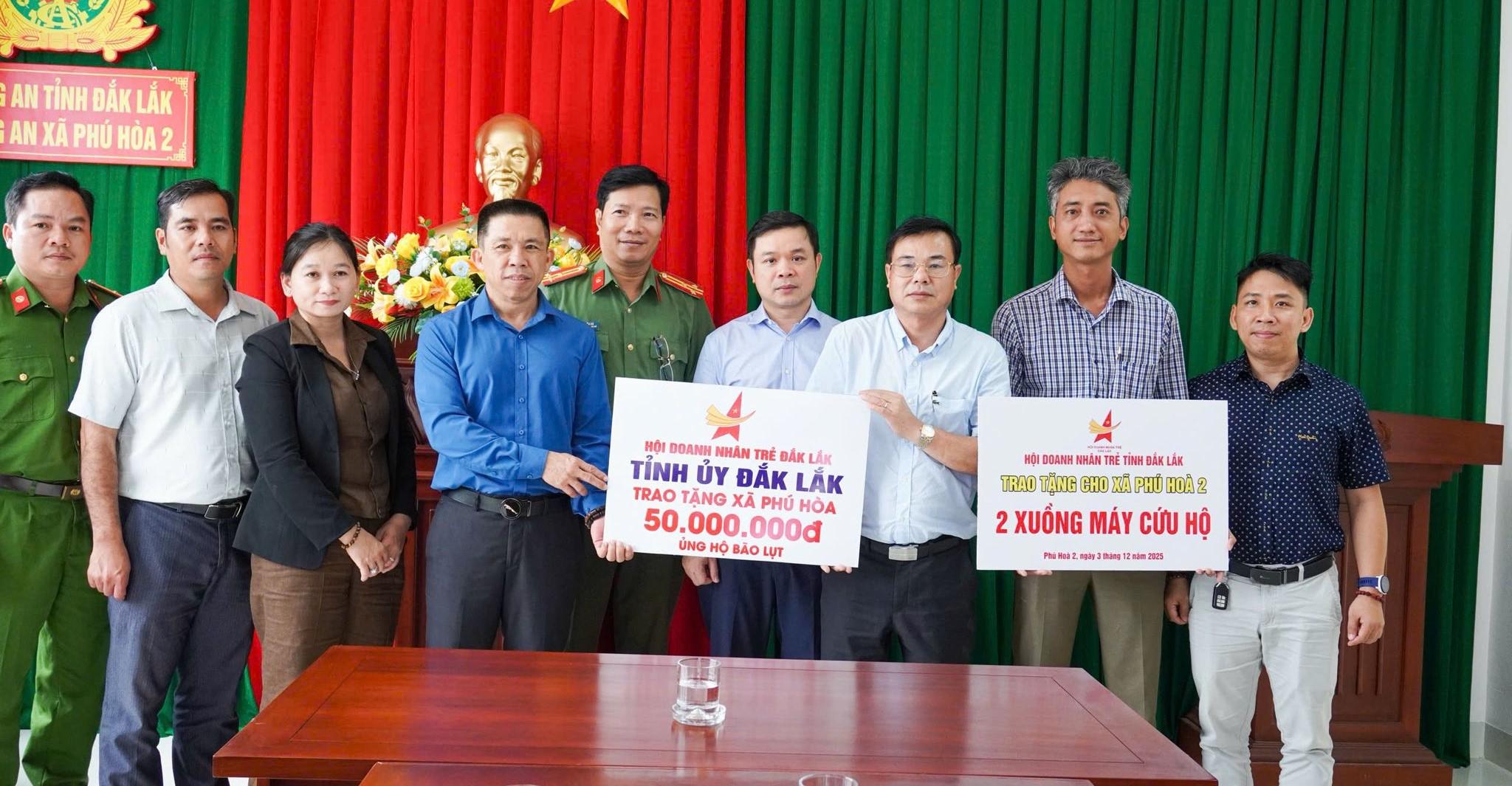 Lãnh đạo Tỉnh ủy Đắk Lắk và Hội Doanh nhân trẻ tỉnh trao 2 xuồng máy hỗ trợ xã Phú Hòa 2 khắc phục hậu quả bão lũ - Ảnh: HDN