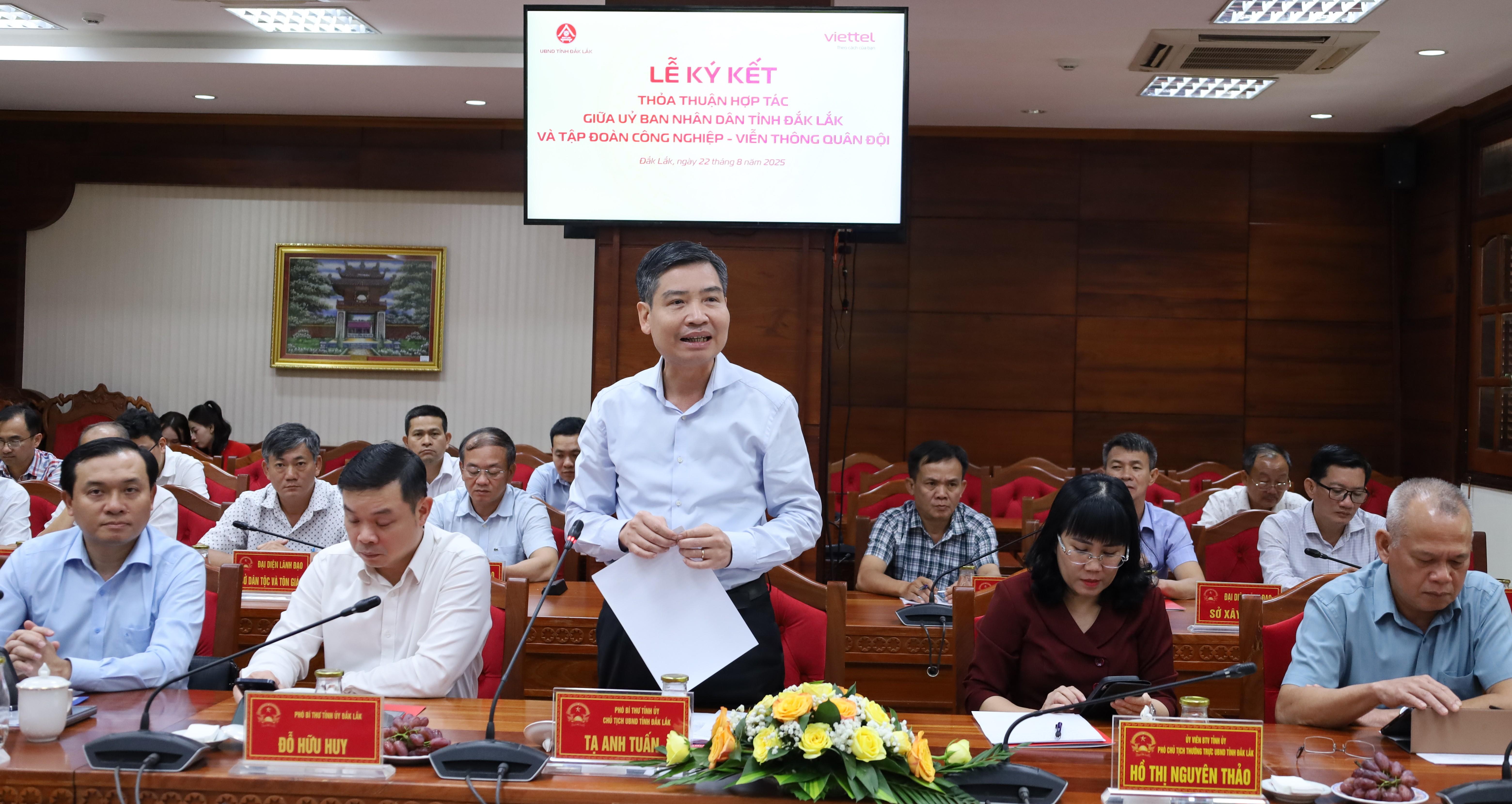 Phát biểu tại buổi lễ, đồng chí Tạ Anh Tuấn, Chủ tịch UBND tỉnh cho biết, tỉnh Đắk Lắk xác định chuyển đổi số là một trong những nhiệm vụ trọng tâm và động lực để thực hiện cải cách hành chính và thực hiện mô hình chính quyền hai cấp hiệu quả, phục vụ nhân dân. Chương trình ký kết sẽ mở ra nhiều hướng hợp tác lâu dài để đưa chuyển đổi số phục vụ cho công tác chỉ đạo điều hành hiệu quả, nâng cao đời sống nhân dân ở vùng sâu vùng xa. Tỉnh Đắk Lắk mong muốn Tập đoàn Viettel tiếp tục đồng hành trong nhiều lĩnh vực, triển khai hiệu quả các nội dung đã ký kết, đặc biệt là hỗ trợ quản lý làm sạch dữ liệu, đảm bảo an toàn an ninh thông tin, đưa nền tảng số cơ bản đến với người dân.