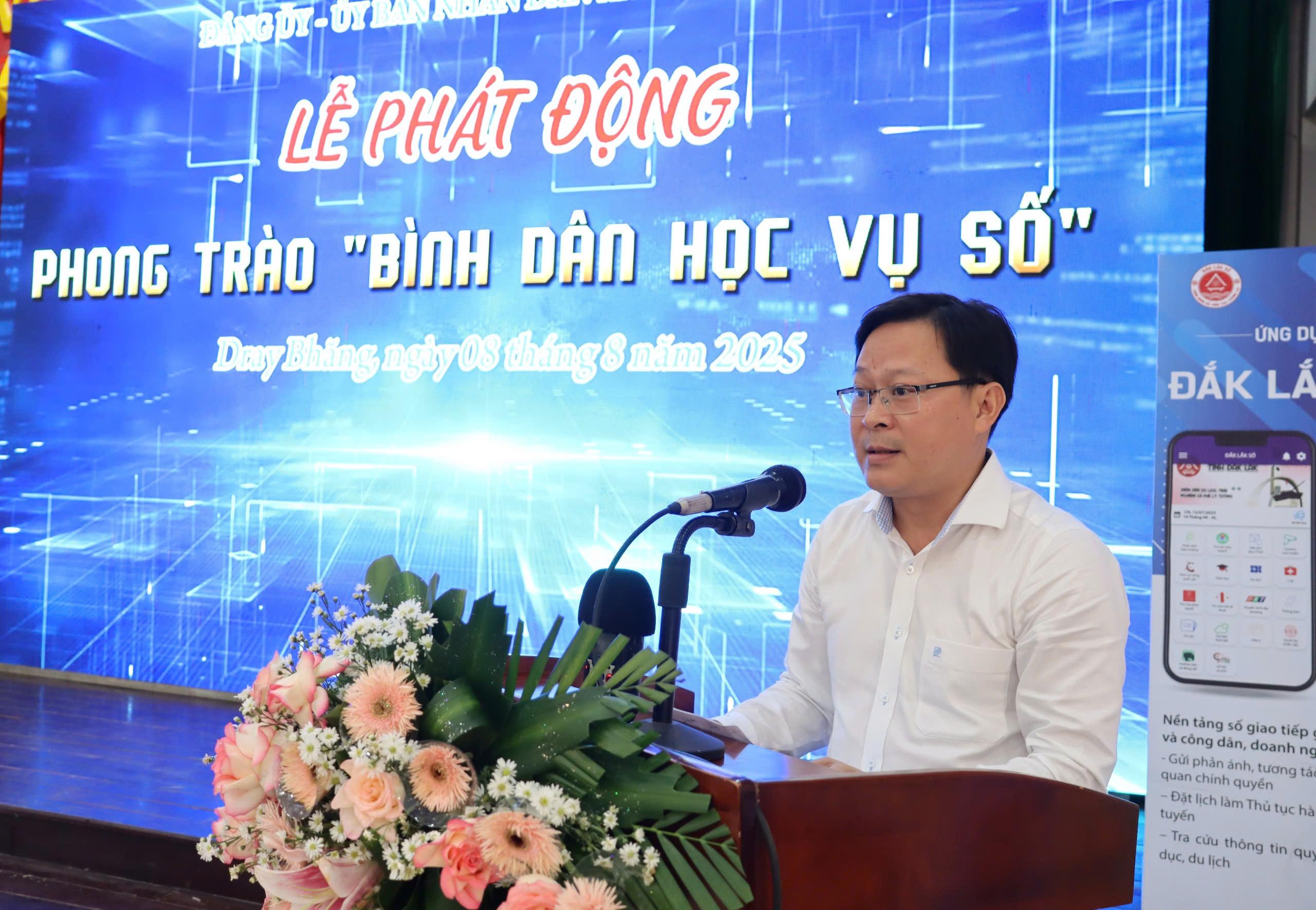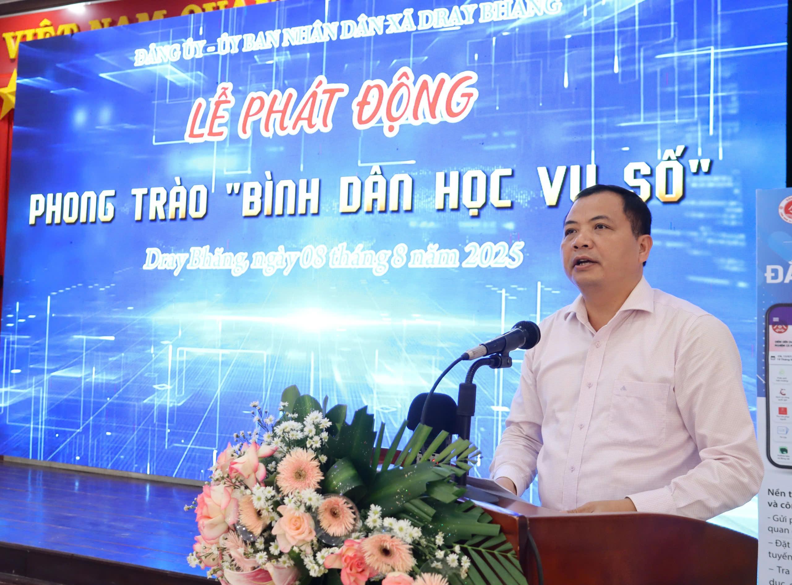 Phát biểu tại buổi lễ, Bí thư Đảng ủy xã Dray Bhăng Nghiêm Văn Chuẩn nhấn mạnh, việc phổ cập kỹ năng số cơ bản cho người dân là nhiệm vụ quan trọng trong tiến trình chuyển đổi số toàn diện. Đồng thời, kêu gọi toàn thể người dân, các tổ chức chính trị - xã hội trên địa bàn cùng chung tay hành động để mỗi gia đình đều có ít nhất một thành viên thành thạo kỹ năng số cơ bản; biết sử dụng ứng dụng định danh điện tử VNeID, thanh toán không dùng tiền mặt, thực hiện dịch vụ công trực tuyến, chủ động tìm kiếm và bảo vệ thông tin cá nhân trên môi trường mạng. Đây chính là nền tảng vững chắc để xã Dray Bhăng hướng tới xây dựng một cộng đồng thông minh, hiện đại và bản sắc.
