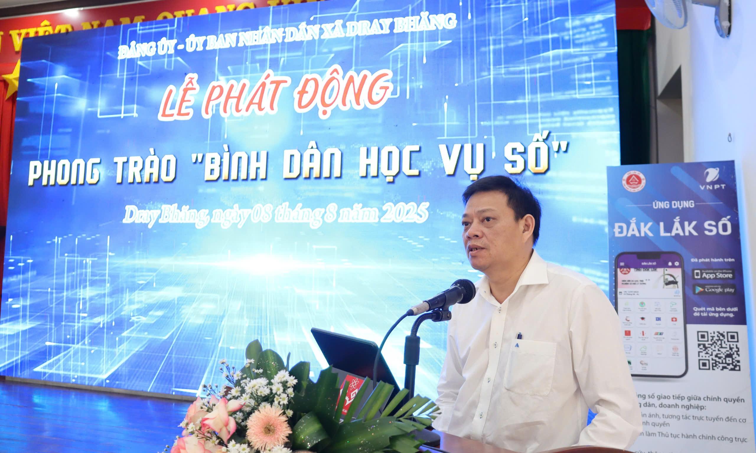 Sáng 8/8, UBND xã Dray Bhăng đã tổ chức Lễ phát động phong trào “Bình dân học vụ số”. Tham dự buổi lễ có Phó Giám đốc Sở Khoa học và Công nghệ Ra Lan Trương Thanh Hà; đại diện lãnh đạo sở, ngành, đơn vị; lãnh đạo xã Dray Bhăng cùng gần 200 cán bộ, công chức; trưởng các thôn buôn và thành viên các tổ công nghệ số cộng đồng; các cơ quan, doanh nghiệp, hộ kinh doanh trên địa bàn.
