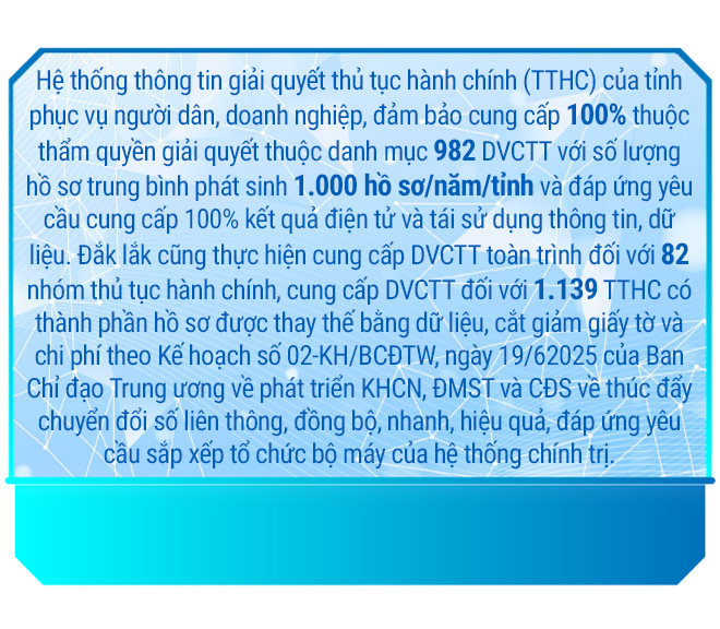 Đặc biệt, thực hiện mô hình chính quyền địa phương 2 cấp, tỉnh Đắk Lắk đã triển khai nhiều sáng kiến mới, tiên phong, điển hình như: thí điểm Đề án “Mỗi xã, phường một KOL"; ra mắt bộ ứng dụng số phục vụ chính quyền 2 cấp: Dashboard giám sát, Trợ lý ảo AI về phân cấp, phân quyền, hướng dẫn thủ tục hành chính công, lập các nhóm Zalo kết nối trực tiếp lãnh đạo tỉnh với cơ sở phục vụ công tác chỉ đạo, điều hành... Đến nay, hệ thống đã dần đi vào vận hành ổn định, thông suốt; các nền tảng, ứng dụng, dịch vụ số phục vụ người dân và doanh nghiệp giúp gia tăng sự hài lòng, mang lại nhiều kết quả tích cực.
