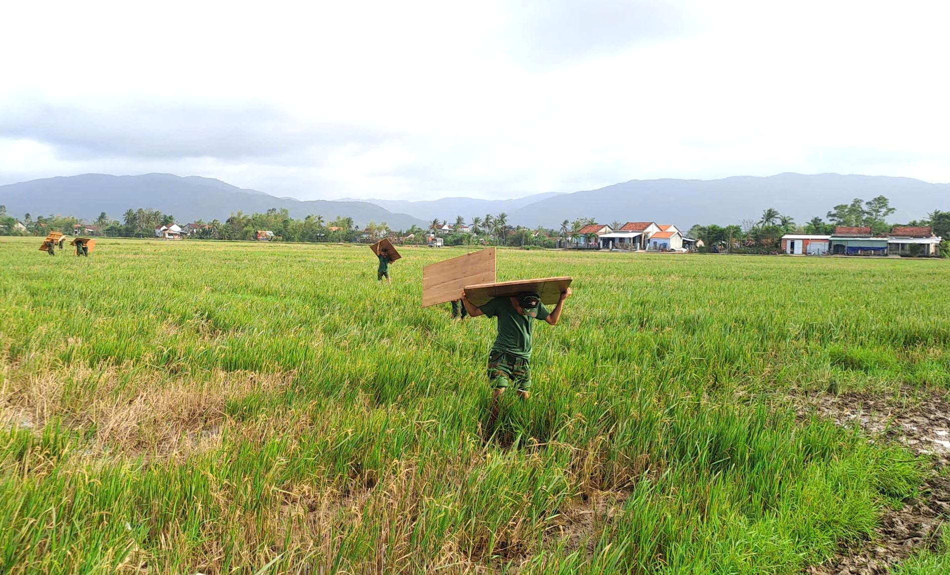 Cán bộ, chiến sĩ Lữ đoàn Đặc công bộ 198 băng qua cánh đồng ruộng vận chuyển vật liệu, giúp người dân xây nhà.