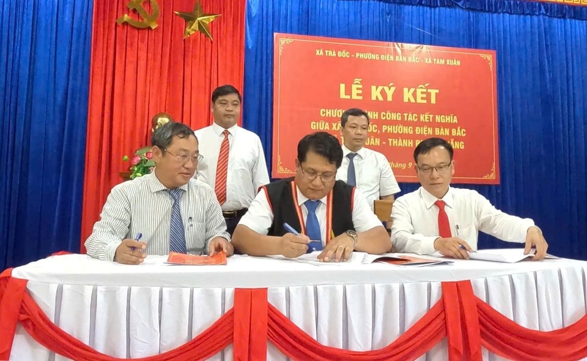 (Dangbodanang.vn) - Ngày 20/9, tại xã Trà Đốc diễn ra lễ ký kết chương trình công tác kết nghĩa giữa phường Điện Bàn Bắc, xã Tam Xuân với xã Trà Đốc. Ủy viên Ban Thường vụ Thành ủy, Giám đốc Sở Dân tộc và Tôn giáo Nguyễn Mạnh Hà đến dự.