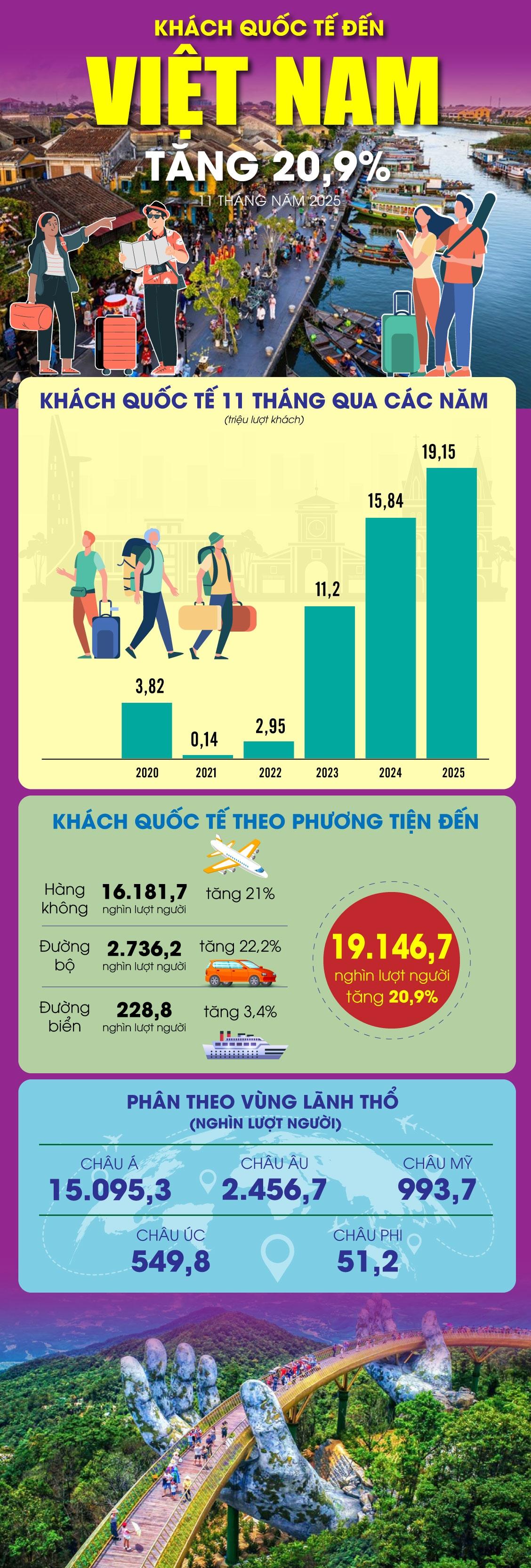 (Infographic) Khách quốc tế đến Việt Nam tăng 20,9% trong 11 tháng năm 2025