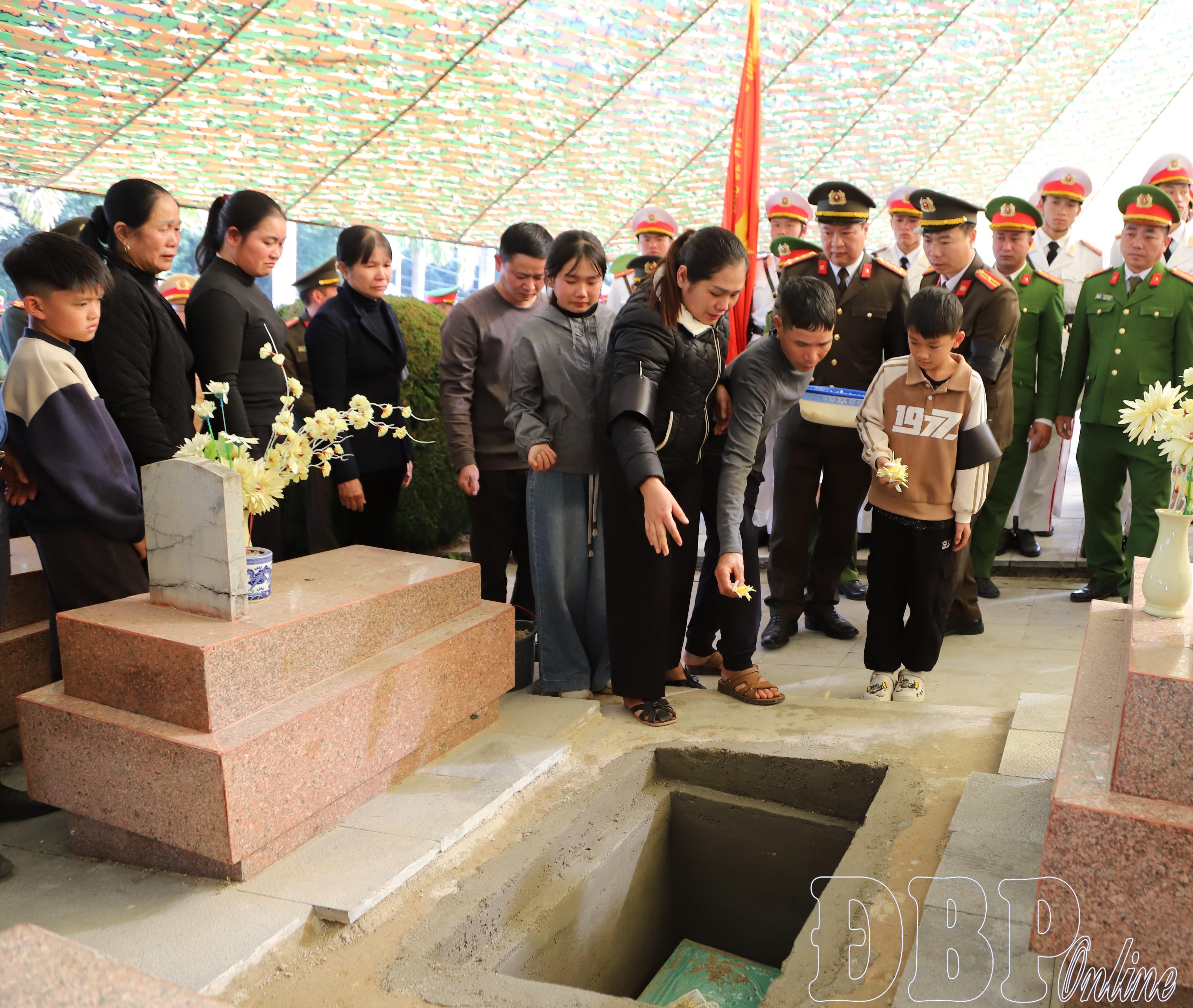 ĐBP - Chiều ngày 10/1, Sở Nội vụ phối hợp với Công an tỉnh tổ chức Lễ viếng, truy điệu và an táng hài cốt liệt sĩ Mào Văn Long tại Nghĩa trang Liệt sĩ Tông Khao, xã Thanh Nưa. Lễ truy điệu và an táng được tổ chức trang trọng, đúng nghi thức. Dự buỗi lễ có đại diện lãnh đạo Công an tỉnh, Sở Nội vụ, Bộ Chỉ huy quân sự tỉnh; cán bộ, công chức, viên chức, chiến sĩ, người lao động thuộc Sở Nội vụ, Công an tỉnh cùng toàn thể gia đình thân quyến của liệt sĩ.
