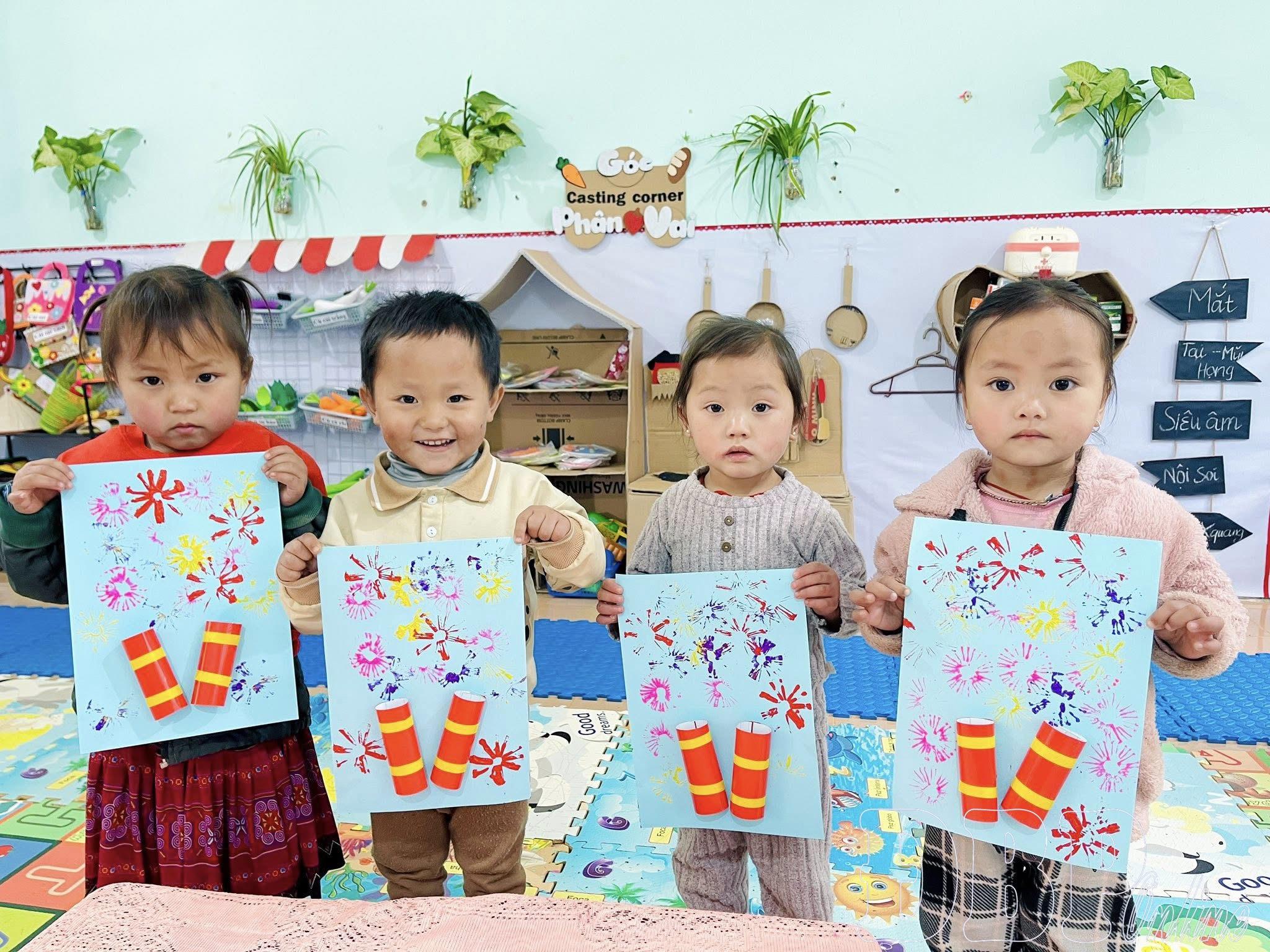 Tại một lớp học khác, cô giáo Điêu Thị Lệ và hơn 20 học sinh lớp mẫu giáo ghép B2 đang rộn ràng với hoạt động trang trí tranh pháo hoa ngày tết. Cô Lệ cho hay, đây là một trong số các tiết học trải nghiệm được cô và giáo viên trong trường sáng tạo, nhằm đổi mới cách dạy và học, thu hút trẻ hăng say đến lớp, học tập dịp lễ tết. “Các con đều tỏ ra rất thích thú và háo hức với những hoạt động như thế này. Thông qua đó, chúng tôi kỳ vọng giúp trẻ phát triển khả năng sáng tạo, góp phần lan tỏa không khí tết cổ truyền, mang đến những trải nghiệm học tập vui tươi và ý nghĩa, kích thích mong muốn tới lớp, tới trường của trẻ”, cô Lệ chia sẻ.