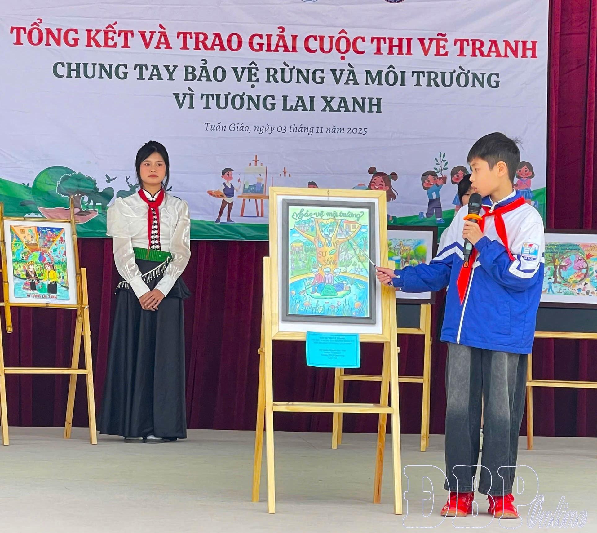 Xuất sắc giành giải Đặc biệt tại cuộc thi là bức tranh mang thông điệp mạnh mẽ về bảo vệ môi trường, bảo vệ sự sống của em Nguyễn Đức Vĩnh, lớp 7A1, Trường THCS Quài Cang, xã Tuần Giáo. Vĩnh chia sẻ: Trong bức tranh, em vẽ các hoạt động như trồng cây, nhặt rác bảo vệ môi trường, cùng với đó là hình ảnh những cánh rừng xanh tốt, muông thú sinh sôi phát triển trong những cánh rừng… Qua tranh vẽ, em muốn gửi tới mọi người thông điệp hãy cùng nhau bảo vệ rừng để bản mình luôn bình yên.