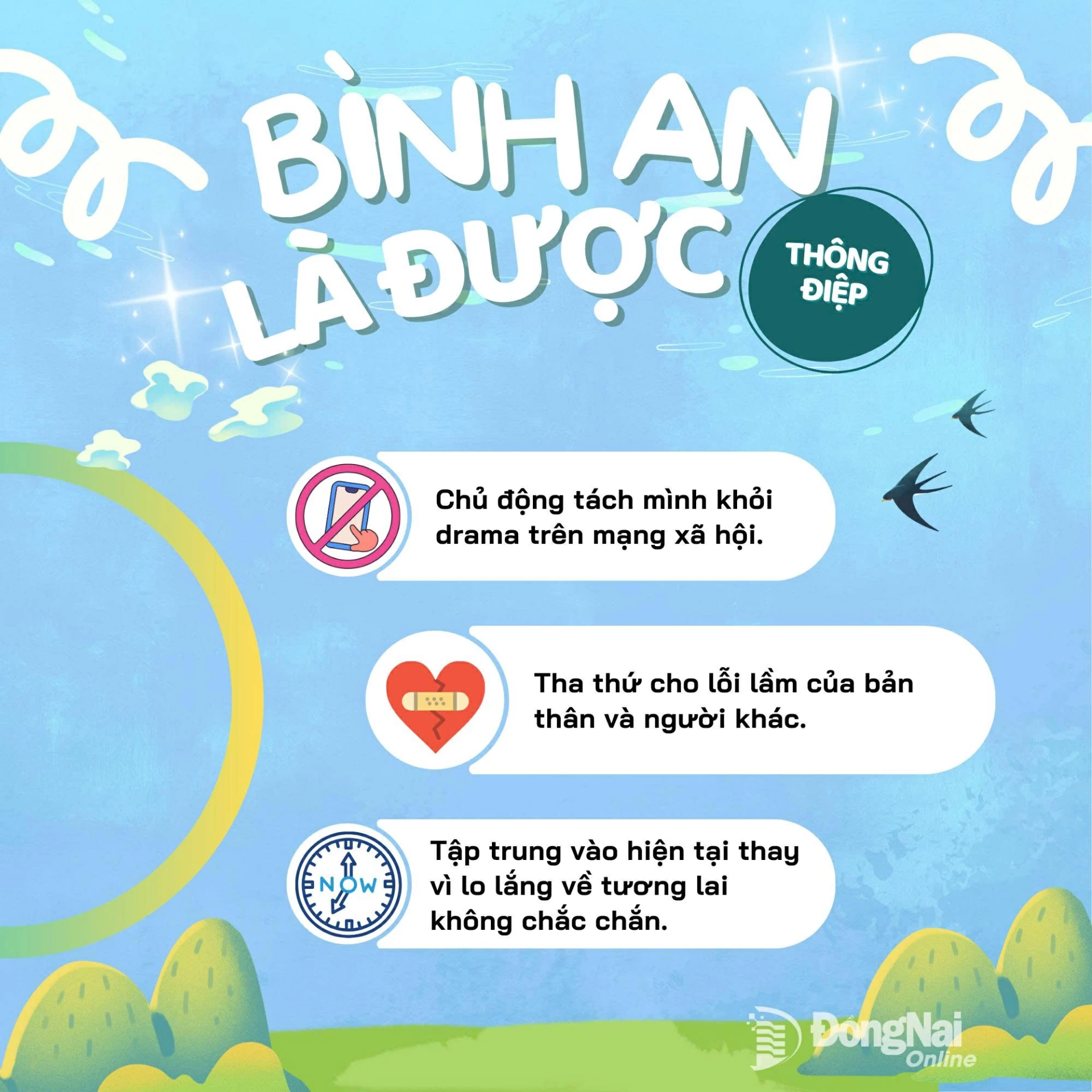 | 3 hành động "xả" phiền não theo tinh thần "Bình an là được". Đồ họa: Kim Thoa |