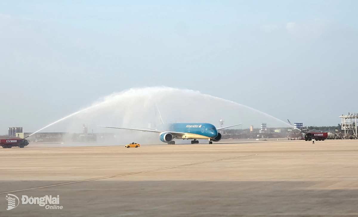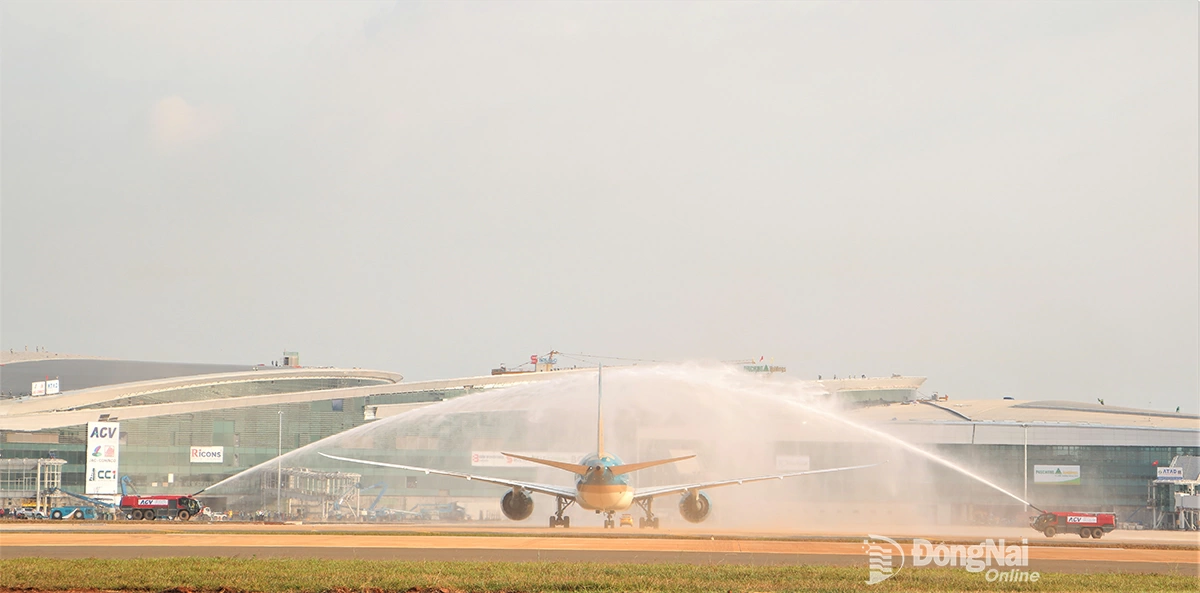 | Thực hiện nghi thức phun vòi rồng chào mừng chuyến bay đầu tiên hạ cánh xuống Sân bay Long Thành thành công. Ảnh: Phạm Tùng |