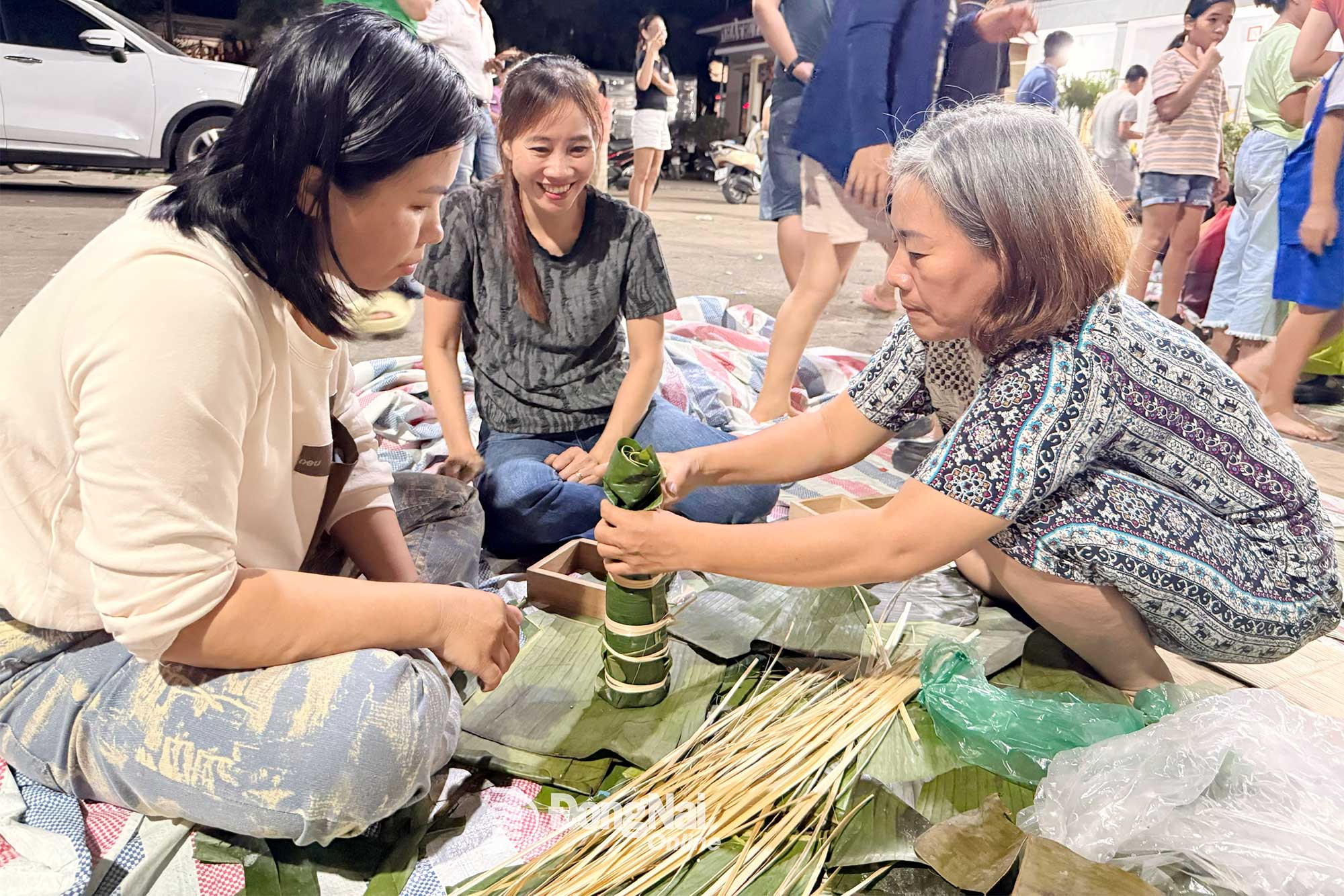 | Các chị em phường Trảng Dài, tỉnh Đồng Nai hướng dẫn nhau cách gói bánh tét để có thêm nhiều đòn bánh gửi hỗ trợ đồng bào. Ảnh: Công Nghĩa |