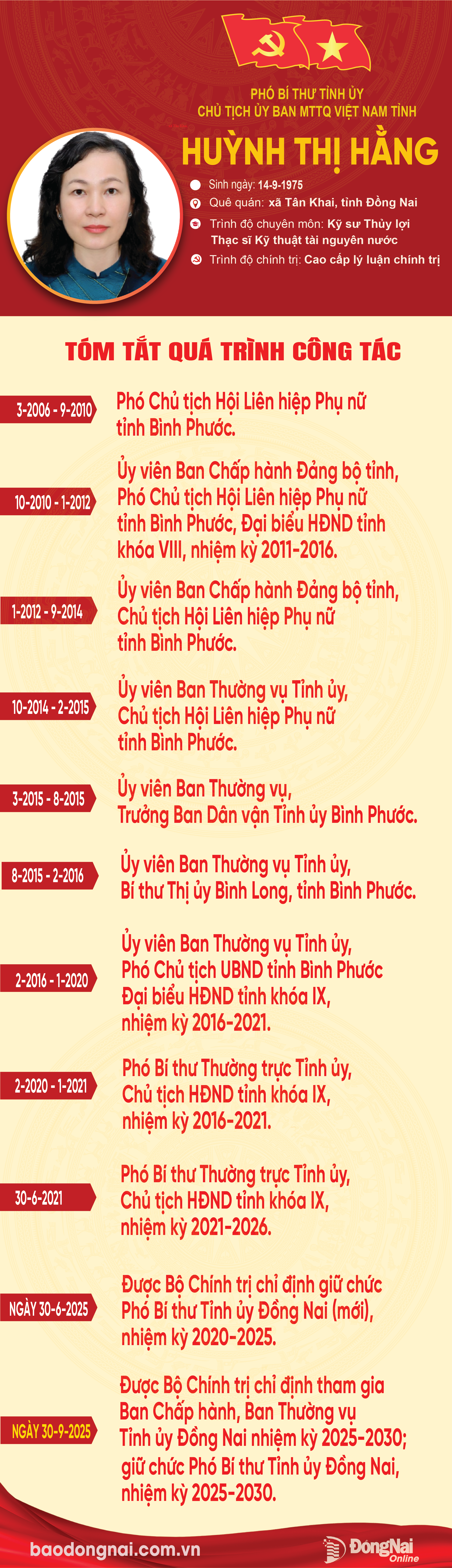 [Infographic] Tóm tắt quá trình công tác của đồng chí Huỳnh Thị Hằng, Phó Bí thư Tỉnh ủy, Chủ tịch Ủy ban MTTQ Việt Nam tỉnh Đồng Nai