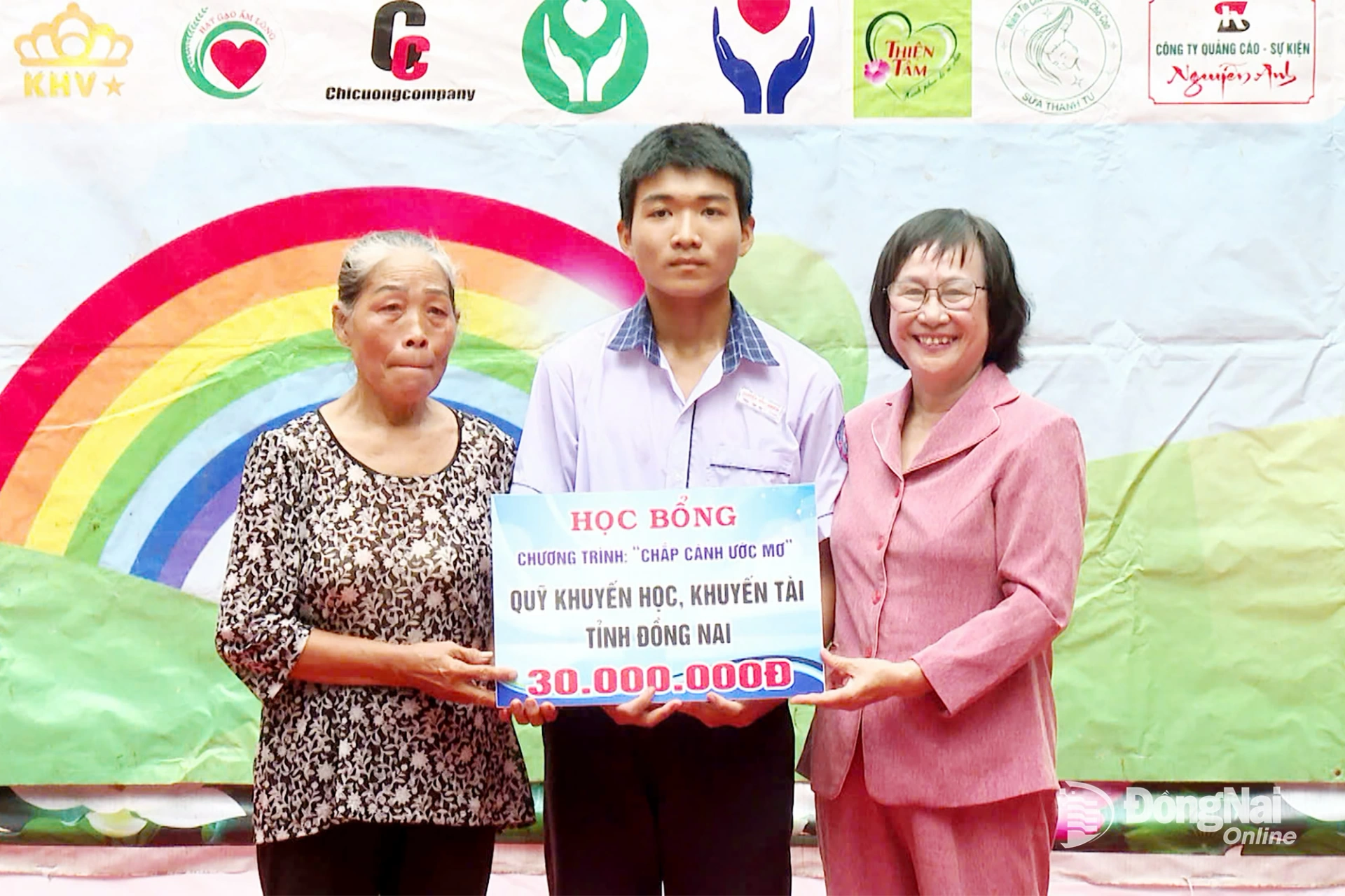 | Bà Nguyễn Thị Ngọc Dung, Phó Chủ tịch Hội Khuyến học tỉnh Đồng Nai trao học bổng khuyến học trị giá 30 triệu đồng. Ảnh: Phú Quý |