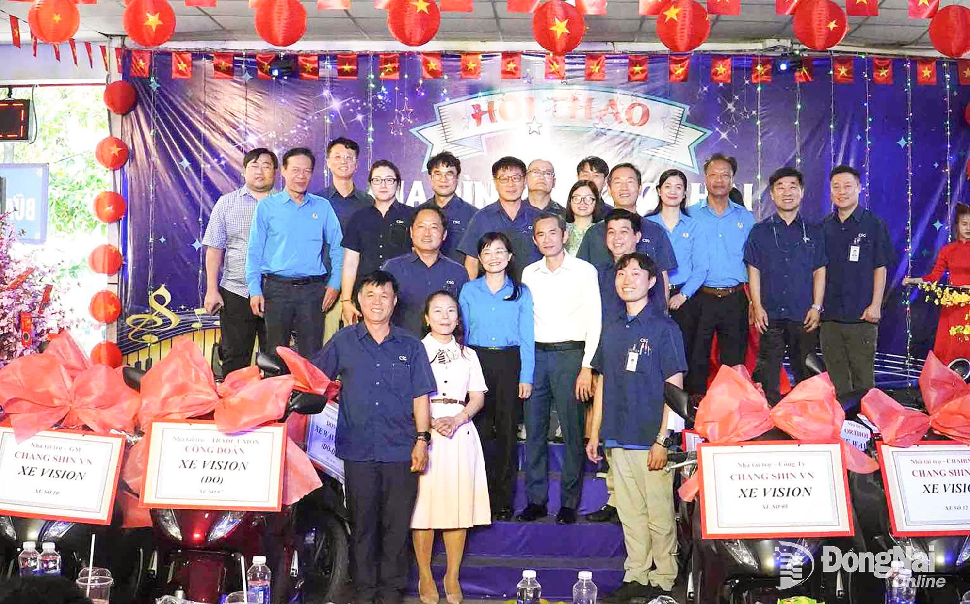 | Lãnh đạo Ủy ban MTTQ Việt Nam tỉnh và Liên đoàn Lao động tỉnh Đồng Nai cùng công ty trao quà bốc thăm trúng thưởng cho công nhân tại Bữa cơm tất niên Công đoàn. Ảnh: Thảo My |