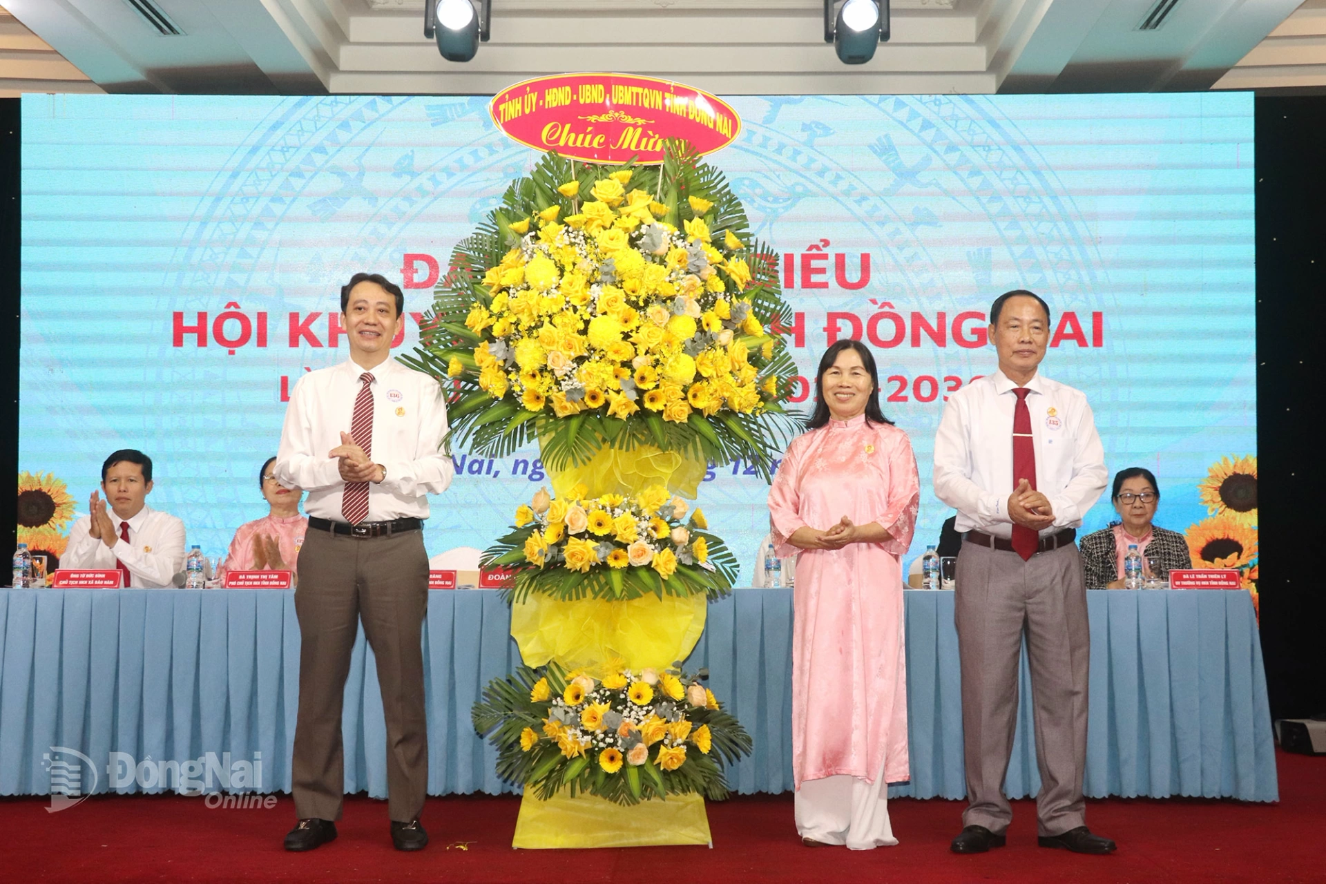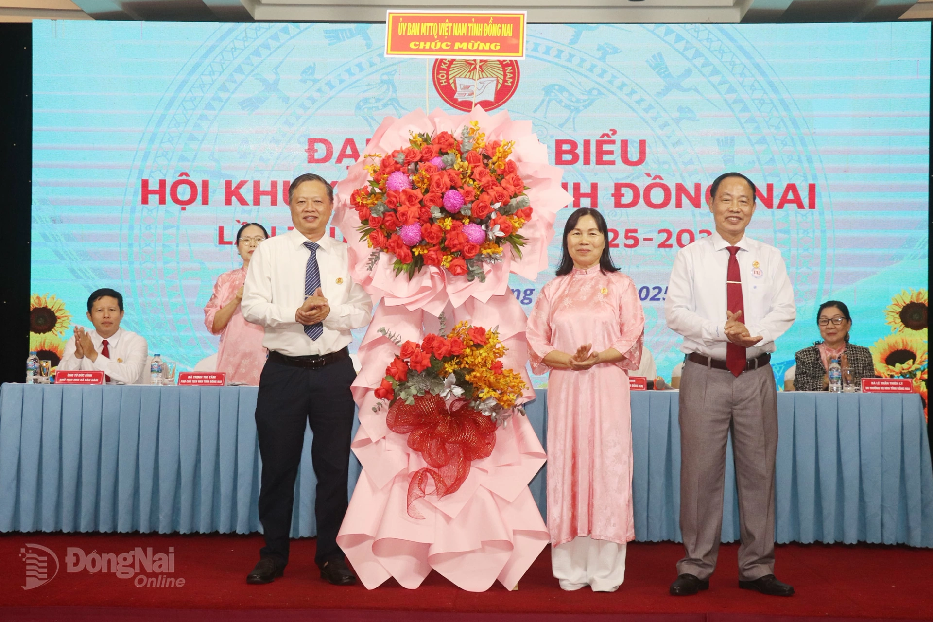 | Phó Chủ tịch Ủy ban MTTQ Việt Nam tỉnh Đồng Nai Nguyễn Tấn Phú tặng lẵng hoa chúc mừng Đại hội đại biểu Hội Khuyến học tỉnh Đồng Nai lần thứ I, nhiệm kỳ 2025-2030. Ảnh: Hải Yến |