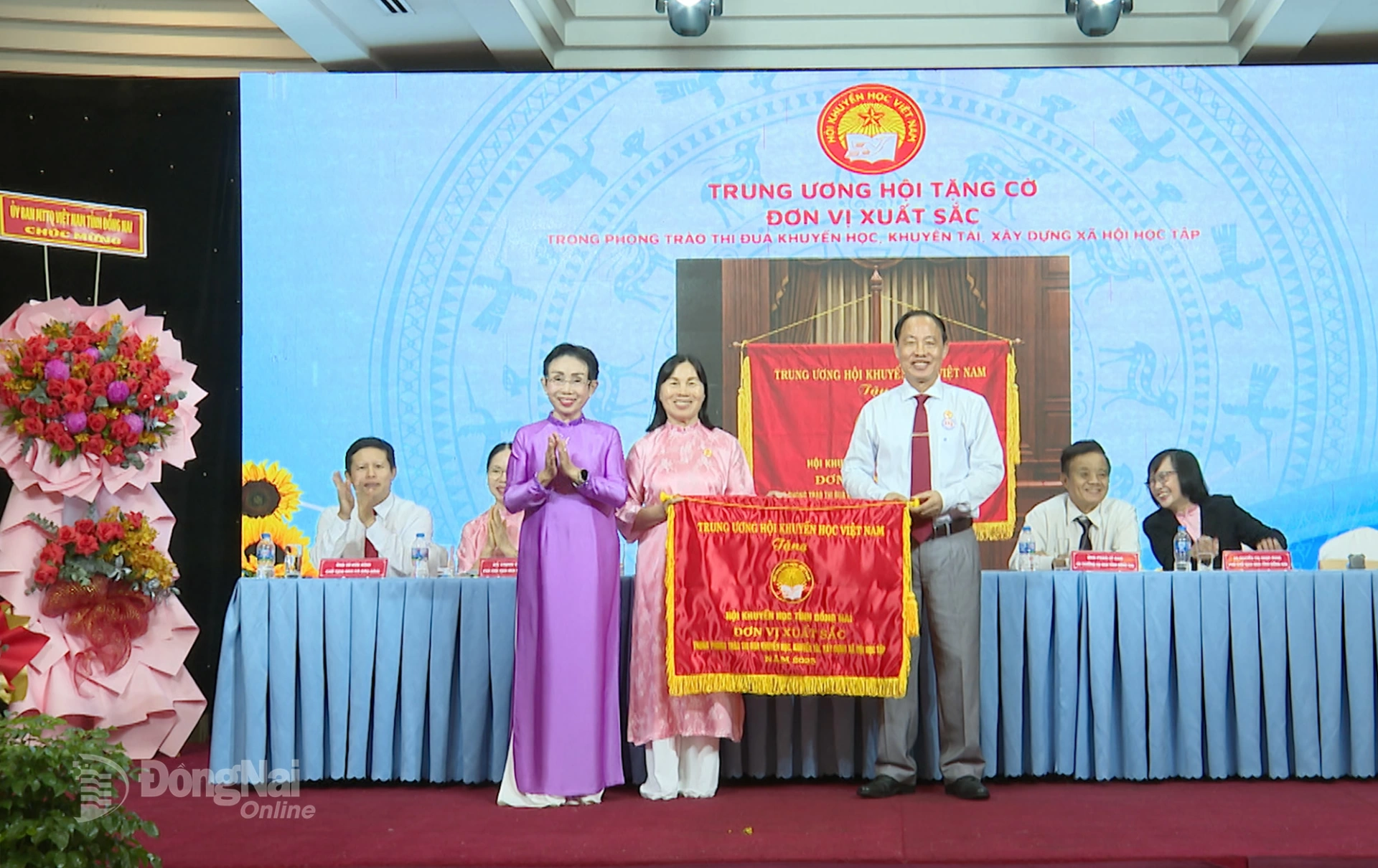 | Lãnh đạo Trung ương Hội Khuyến học Việt Nam tặng Cờ thi đua Đơn vị xuất sắc năm 2025 cho Hội Khuyến học tỉnh Đồng Nai. Ảnh: Hải Yến |