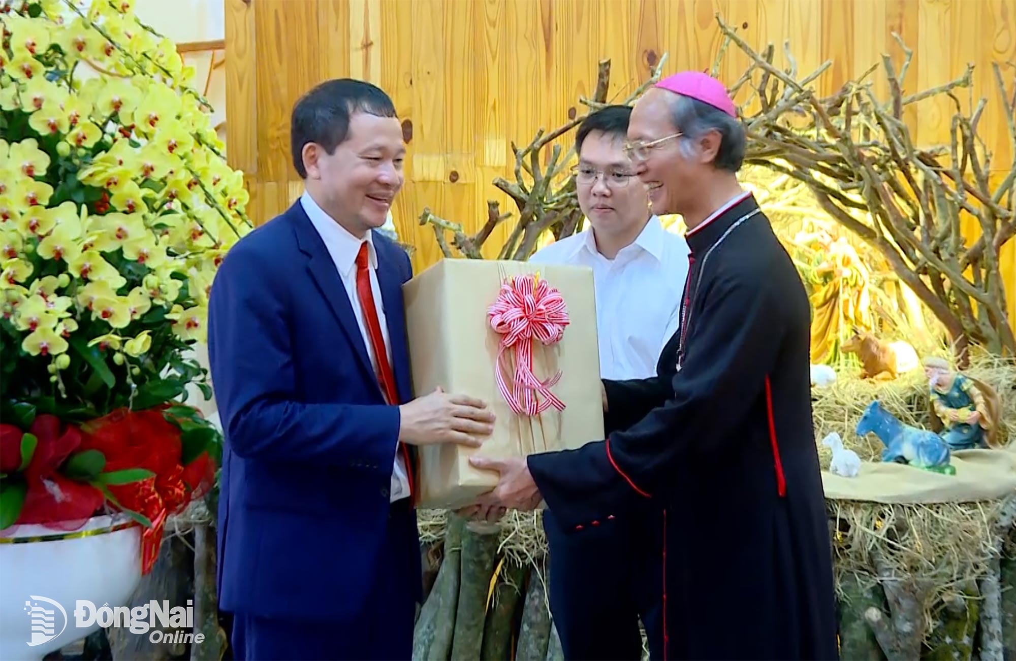 | Đồng chí Vũ Hồng Văn, Bí thư Tỉnh ủy, Trưởng đoàn Đại biểu Quốc hội tỉnh Đồng Nai cùng đoàn công tác của Tỉnh ủy - HĐND - UBND - Ủy ban MTTQ Việt Nam tỉnh tặng hoa chúc mừng Giáng sinh Tòa Giám mục Xuân Lộc. Ảnh: Trần Thanh |