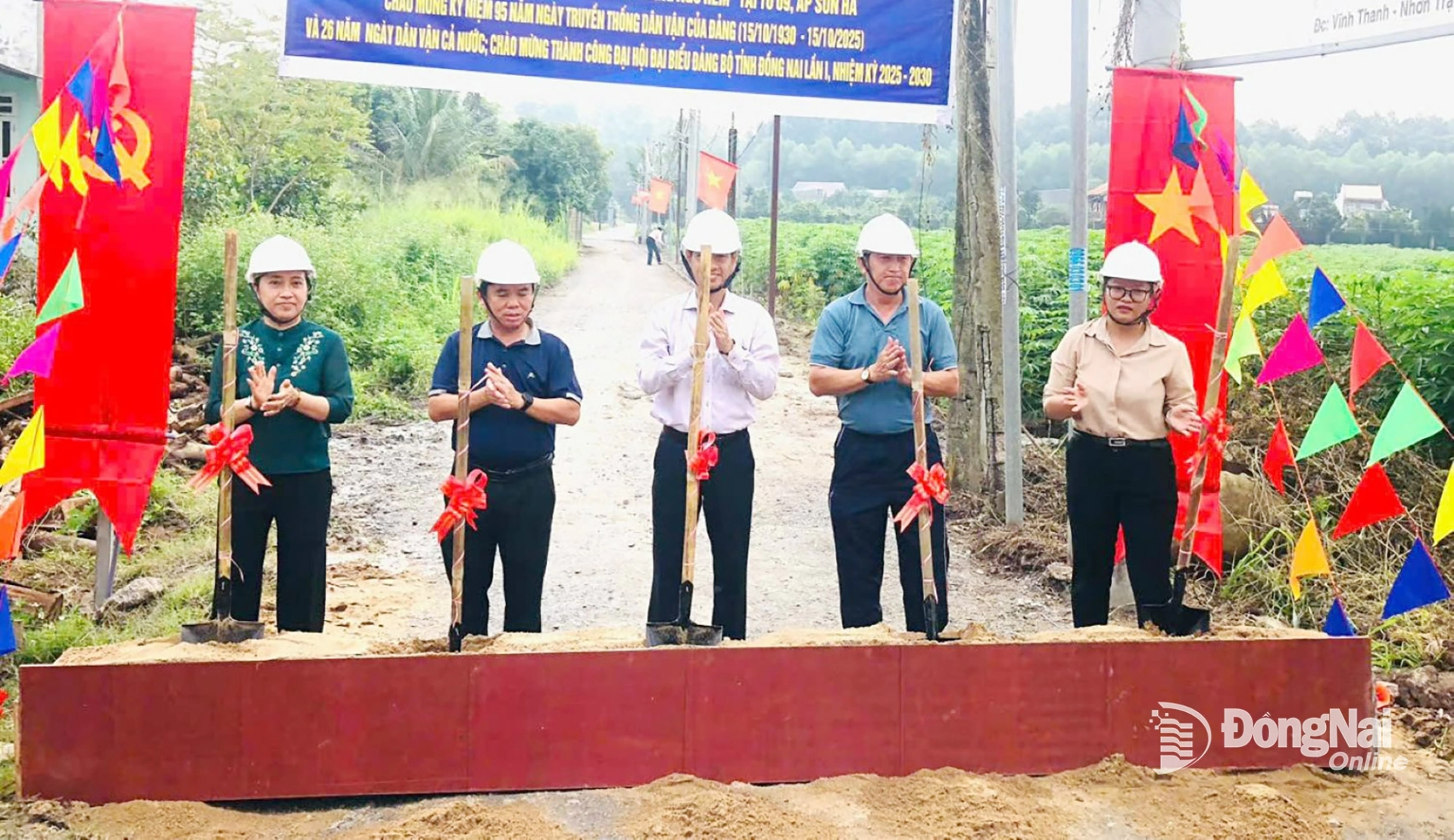 | Lãnh đạo xã Phước An và các đơn vị phối hợp khởi công xây dựng đường nông thôn mới. Ảnh: Đoàn Mai |