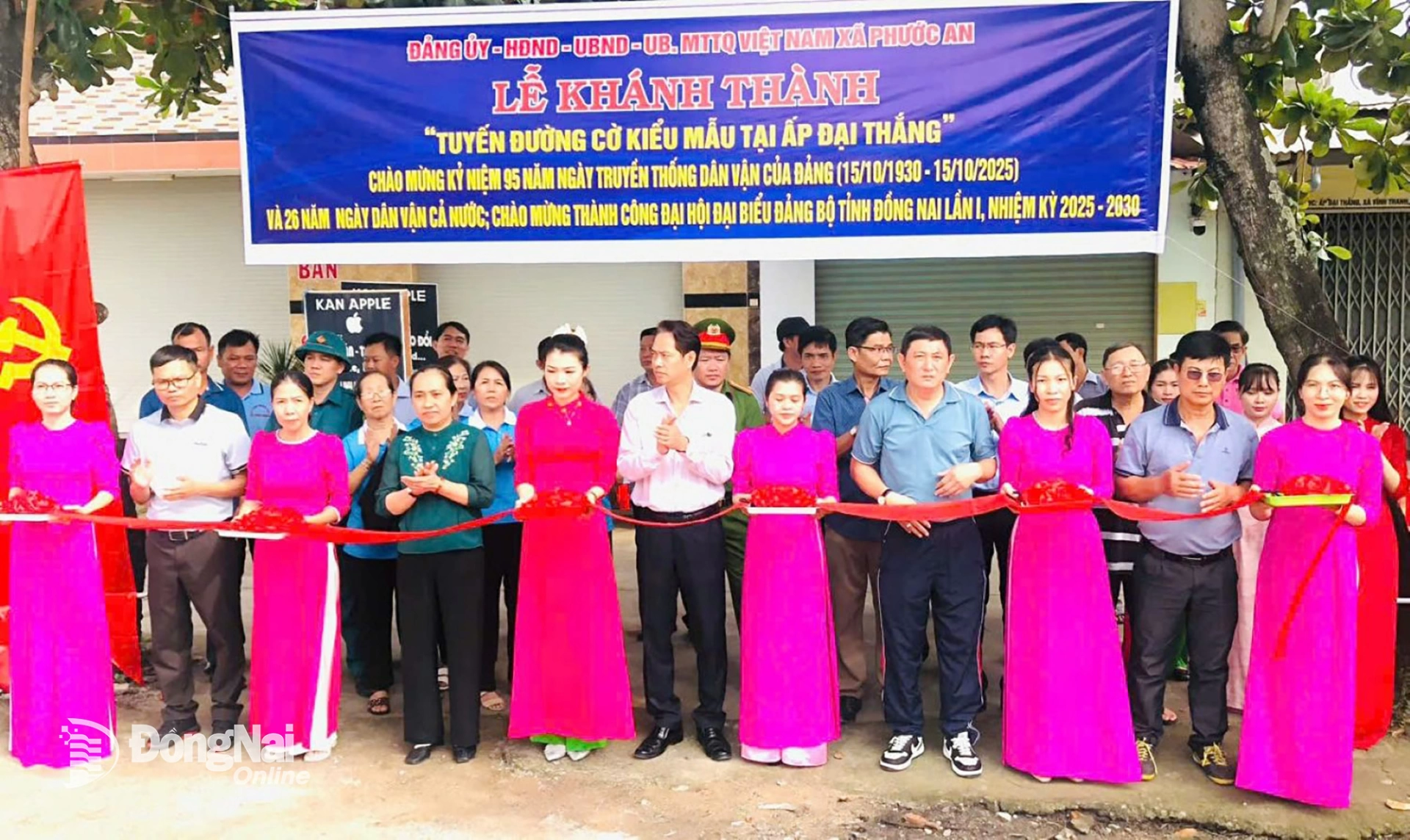 | Lãnh đạo xã Phước An và các đơn vị phối hợp cắt băng khánh thành "Tuyến đường cờ Tổ quốc" trong lễ ra quân làm dân vận. Ảnh: Đoàn Mai |